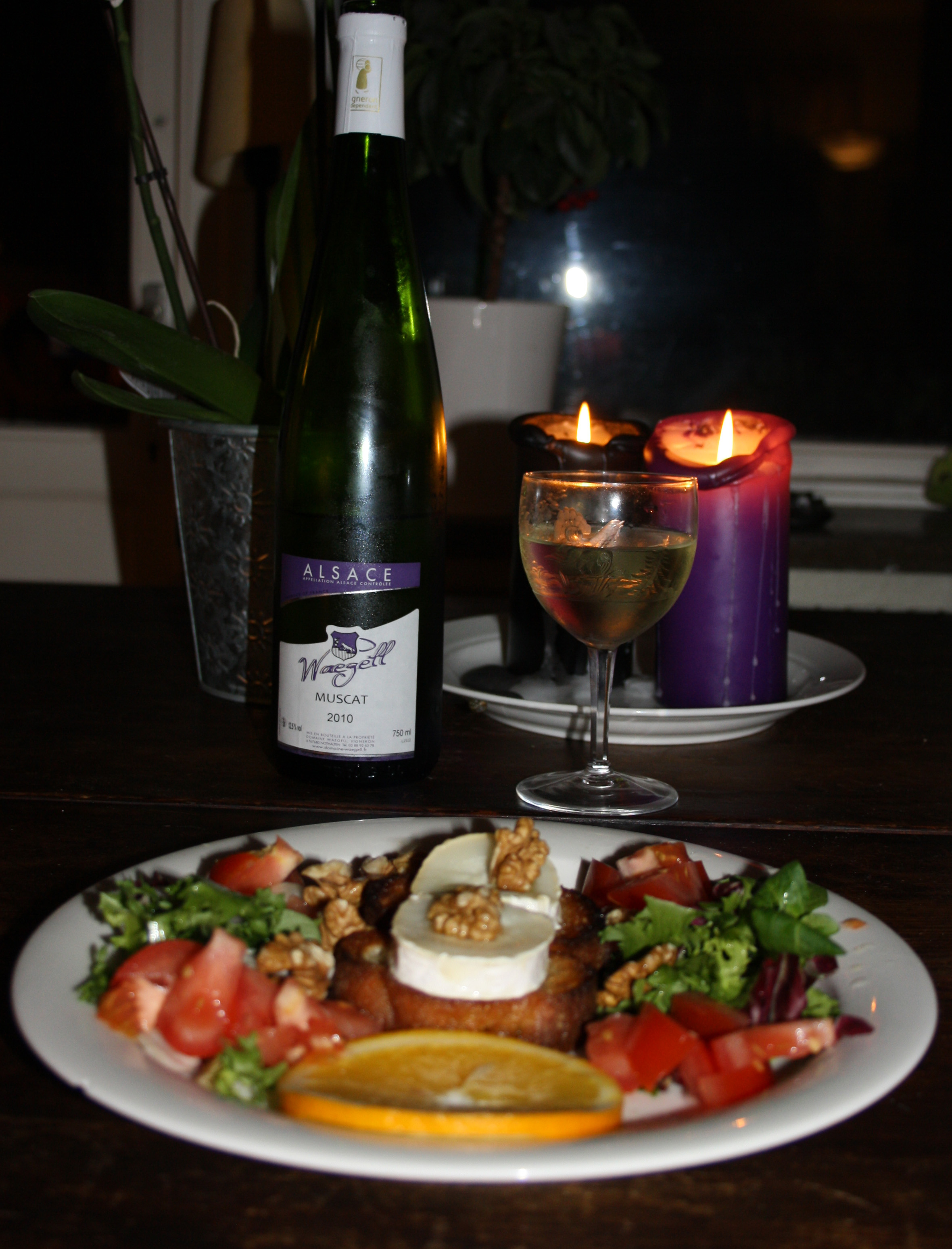 Vi åt det här på sensommarens sista dag (?) tillsammans med lite av sommarens vin, Muscat 2010 från Gerard Waegell. Det är ett ganska fruktigt vin med pigga syror, som balanseras av ett uns sötma. Funkade jättebra till getosttoasten.