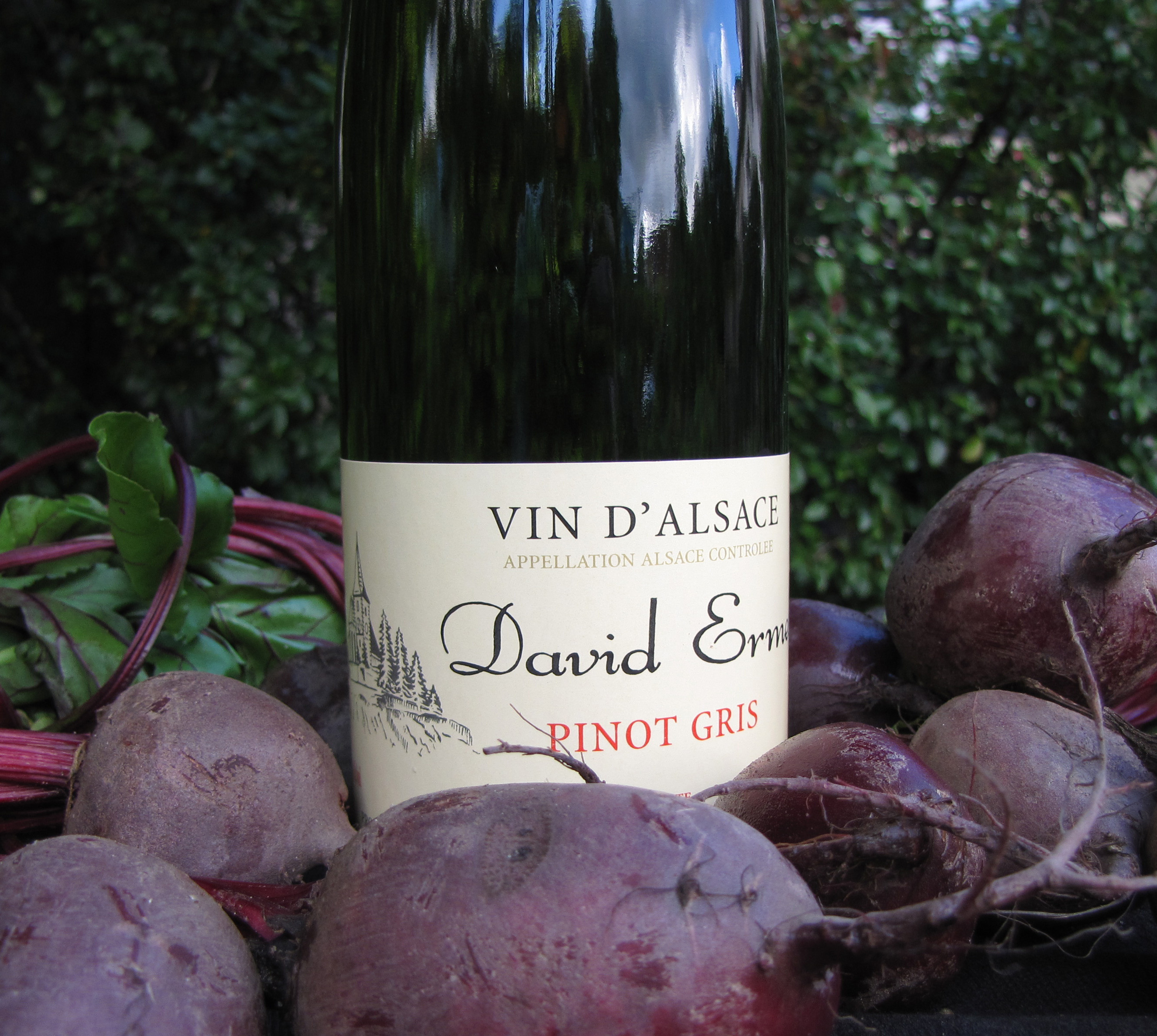Till det här skulle vi ha ett vin. Jag funderade och kom att tänka på David Ermels Pinot Gris. Vi drack en flaska av det vinet i slutet av juli. Den gången tillsammans med grillad lax och sallad – och jag uppskattade inte alls kombinationen. Sötman i vinet framträdde alldeles för mycket.
