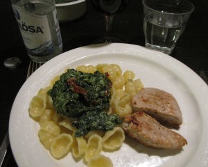 Vi åt maträtten med gnocchi. Gott. Till maten drack vi ett glas Cote du Rhone. Det funkade mindre bra, ett lättare italienskt vin hade varit bättre.