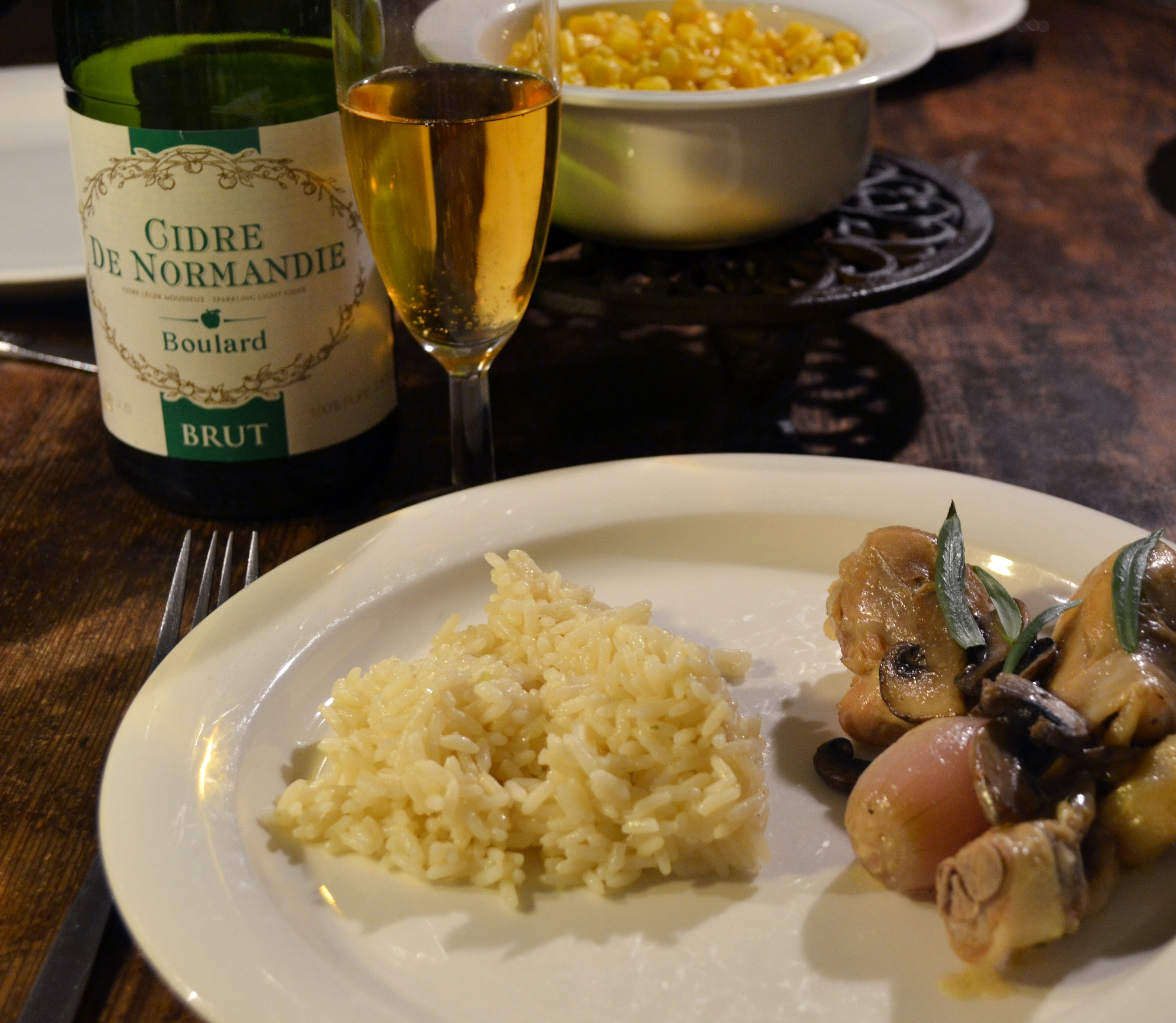 Ät den normandiska kycklinggrytan med pilaffris. Njut gärna ett glas cider till. Vi tog Cidre de Normandie. Piggt, gott och äppligt. Vi testade även med en Riesling, men kryddigheten från dragonen funkade inte alls tillsammans med Rieslingen – trots att den kom från Alsace…