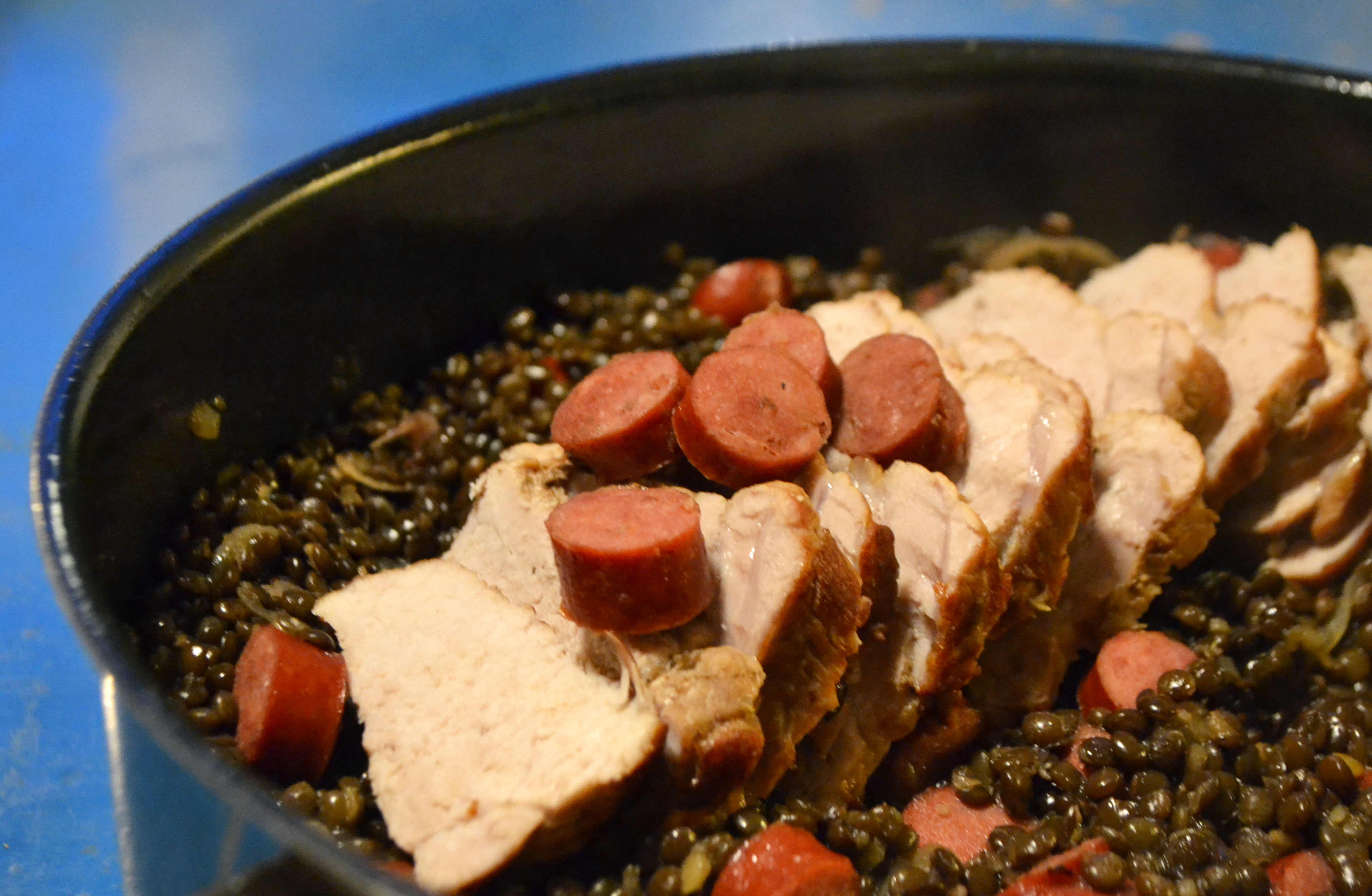 Linser kan vara fantastiskt gott om man väljer en god sort och smaksättning. Här får belugalinser steka tillsammans med fläskytterfilé och kabanossen till en smakrik helhet.