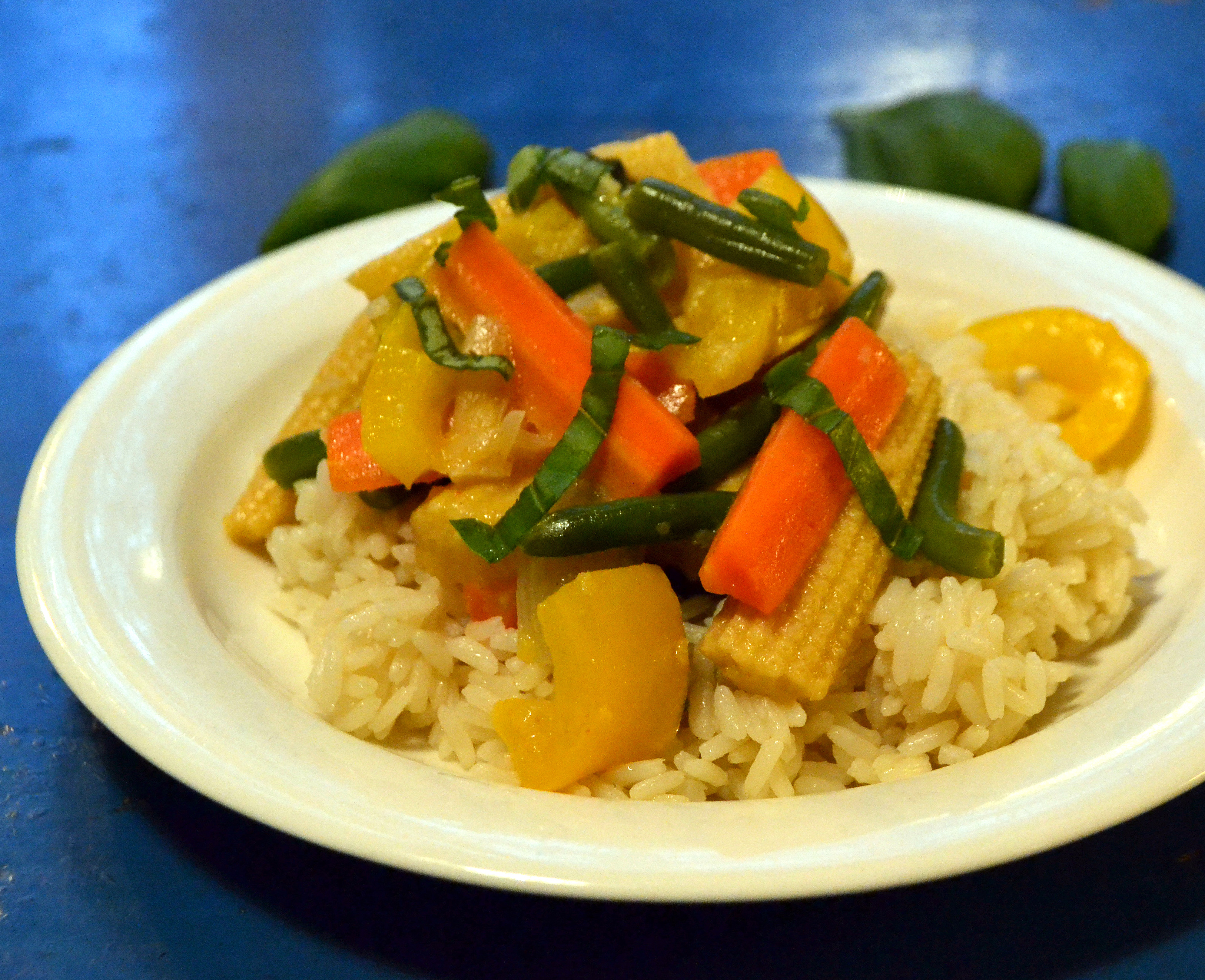 Skär alla grönsakerna i ”wok-stora” bitar, som lillfingrar ungefär. Häll lite olja i en wok (eller stor, tjockbottnad gryta). Fräs morötter och currypasta ett par minuter. Lägg i lök och paprika, därefter bönor och sist minimajs. Fortätt och fräs grönsakerna, lägg i riven ingefära och pressa ner vitlöken. Just vitlök och ingefära ger lite fyllighet åt asiatisk inspirerad mat.