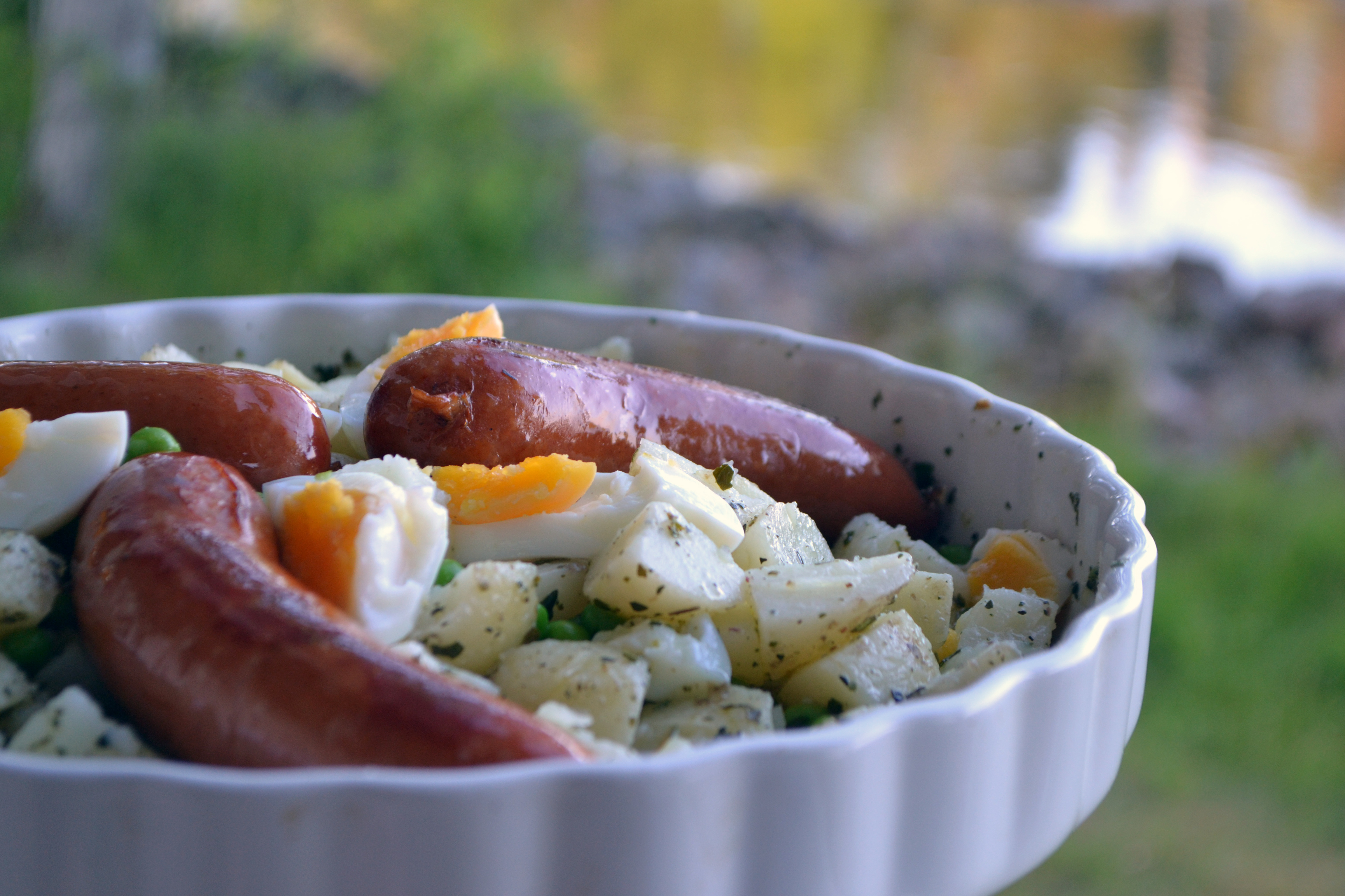 Det här är verkligen en örtig sommar-potatissallad. Vi åt den med kryddiga korvar, men det funkar lika bra med skinka eller bara som en ensamrätt med ett gott bröd.