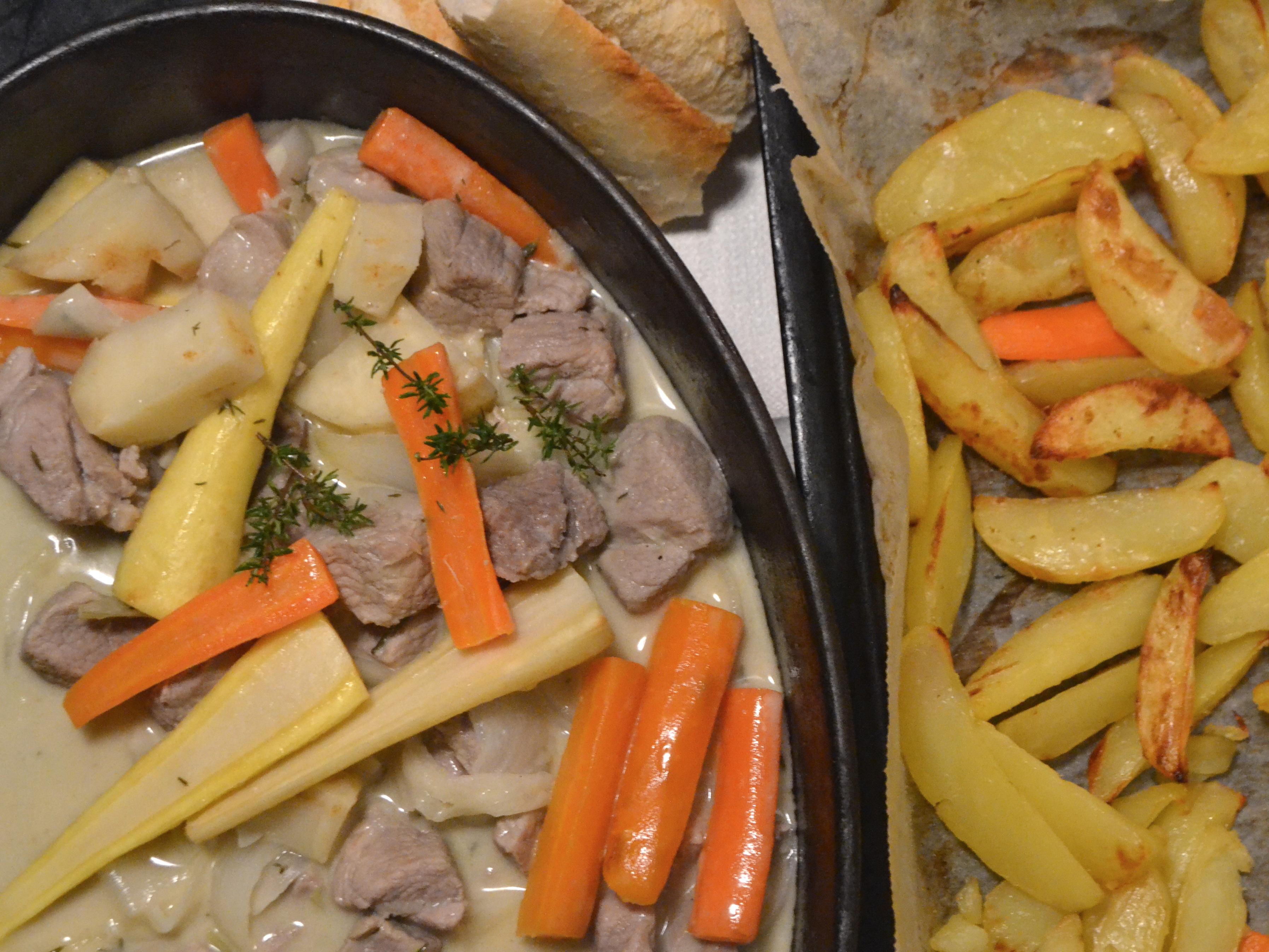 Jag hämtar in lite timjan från den torkande krukan i trädgården och Pinot Gris från sommarens inköp som ligger i källaren. På med grytan och så i med kött, en skvätt grädde, vin och kycklingbuljong. Rotsakerna läggs i en form och rostas i ugnen.
