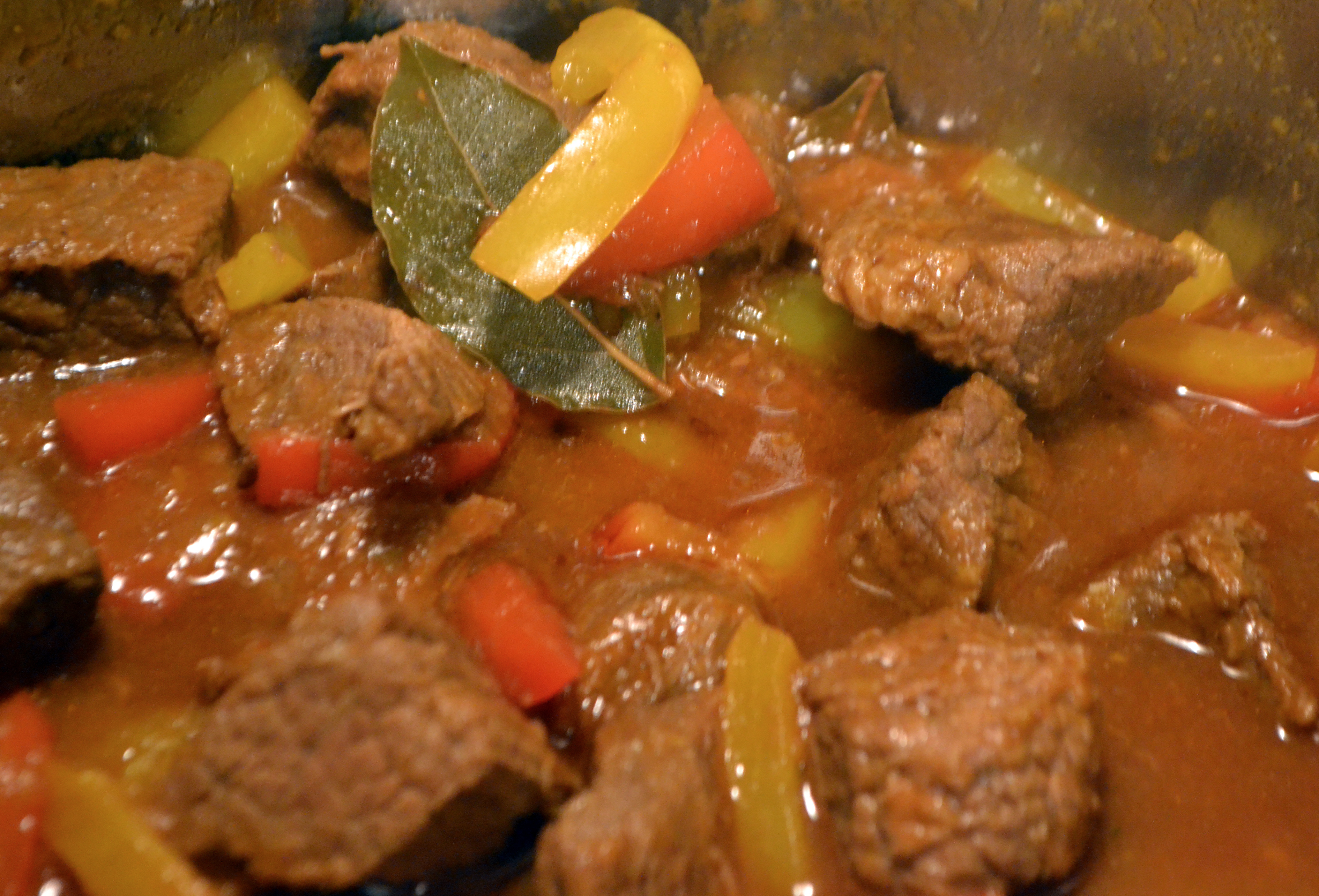 Bryn köttet i omgångar i smör eller olja. Låt löken steka med på slutet. Krydda med salt. Vitpeppar & cayennepeppar. Pressa i vitlöken. Lägg i tomatpuré och lagerblad. Häll på köttbuljong så att det täcker. Koka upp grytan och låt den koka på låg värme i 2 timmar – tills löken har kokat sönder och köttet är så mört att det nästan faller sönder.