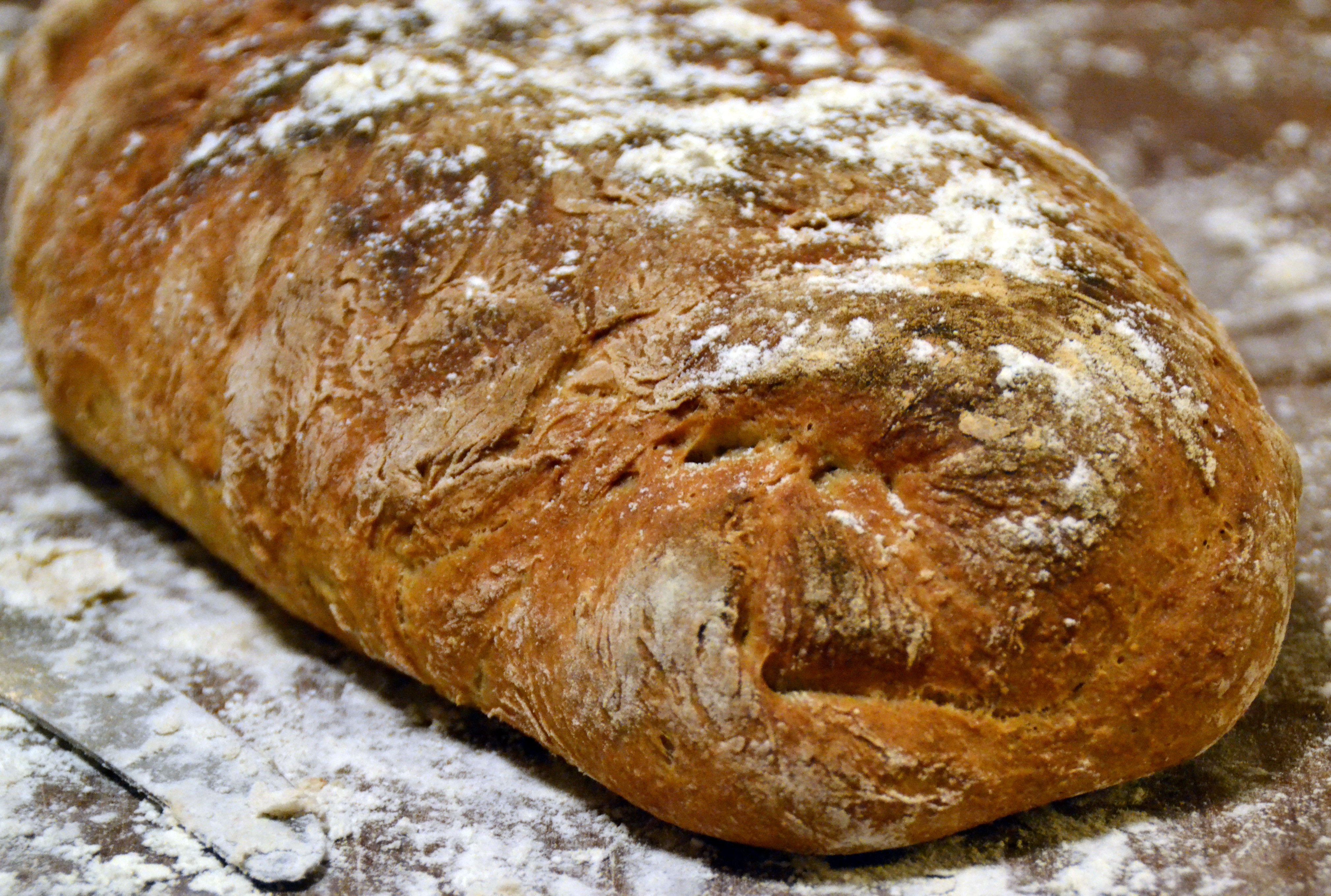 Stjälp upp degen på ett mjölat bakbord och forma till ett bröd. (Ta gärna ganska mycket mjöl och utrusta dig med en bordskniv eller degskrapa – när jag bakade blev det en ganska kladdig deg.) Forma ett stort bröd, lägg det på en bakplåt med bakplåtspapper. Låt jäsa i 30 minuter.