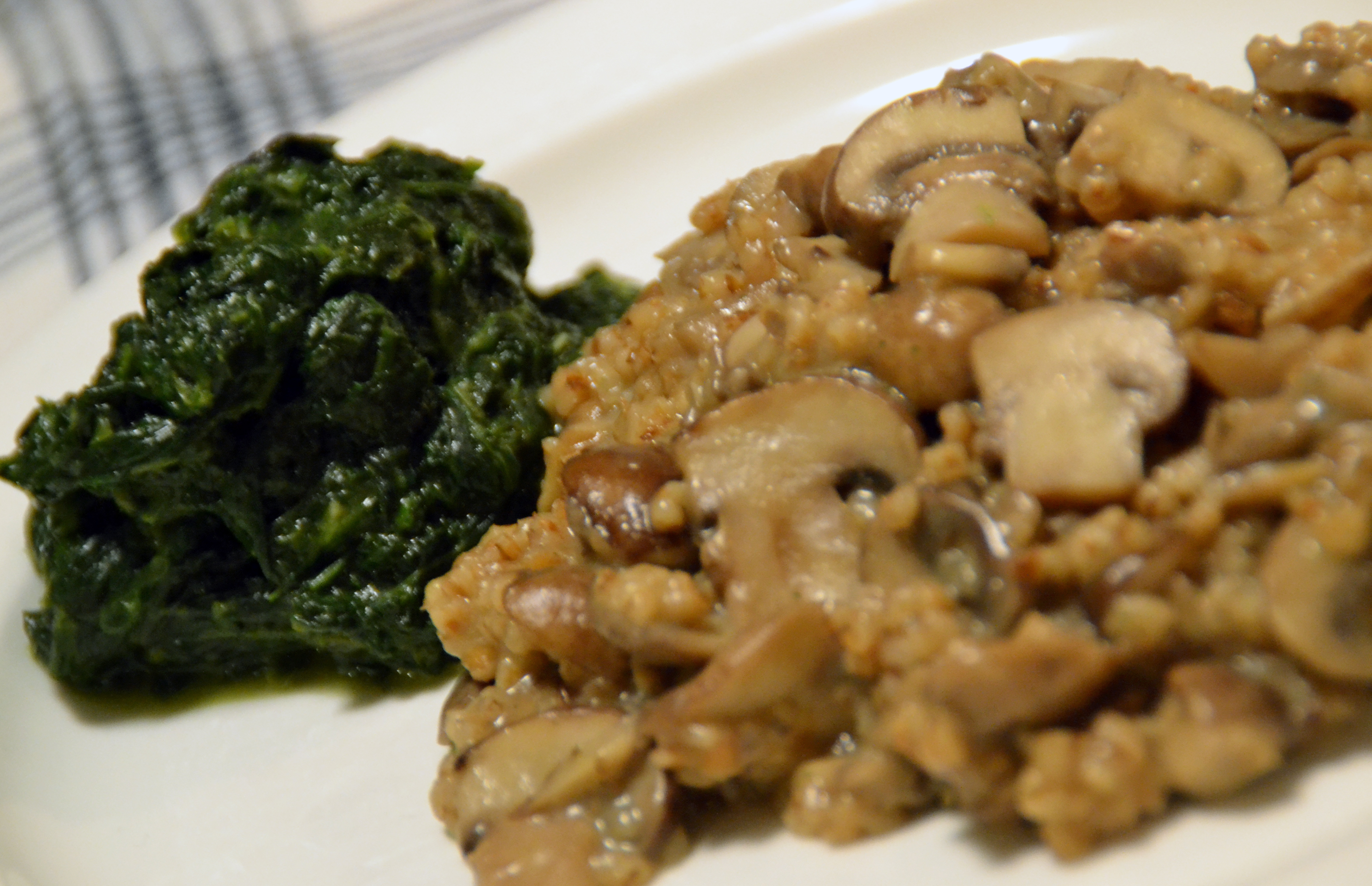 Kornotto med champinjoner blir mustigt, smakrikt och rejält al dente. Tillsamman med spenat kan det fungera som en vegetarisk ensamrätt. Vill man ha det som tillbehör, så funkar det bäst med smakrikt, stekt kött – om man inte vill återskapa den gamla husmanskosten. Då ska man steka sidfläsk och servera med buljongkokt korn.