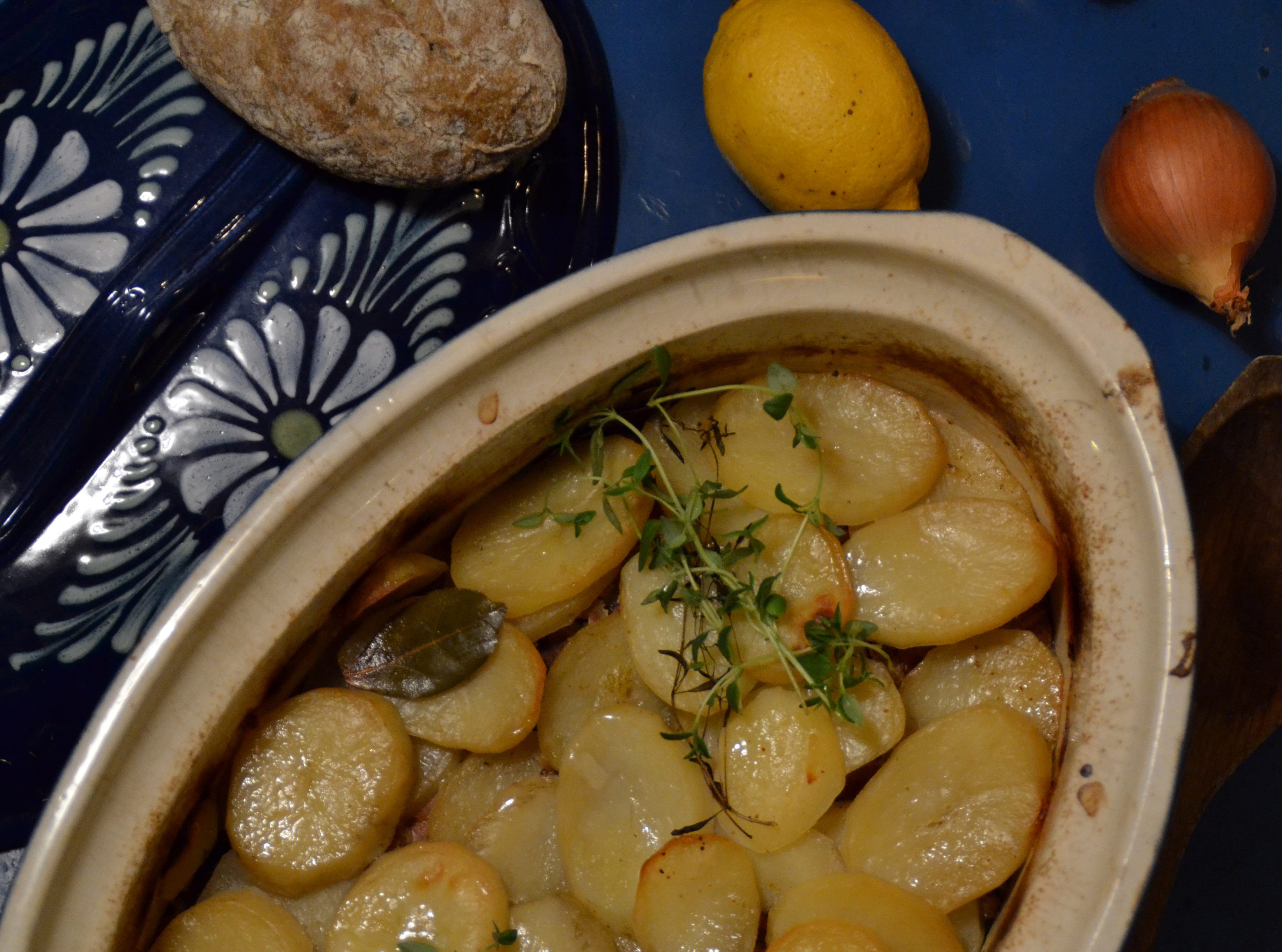 Skala och skiva potatisen ganska tunt. Lägg ner allt i en ugnsfast form. Börja med ett lager potatis, sedan kött, lök och morötter. Lägg dit timjan (om man vill binder man ihop den till en bukett som går lätt att ta bort). Avsluta med ett lager potatis. Häll på köttbuljong och vitt vin.