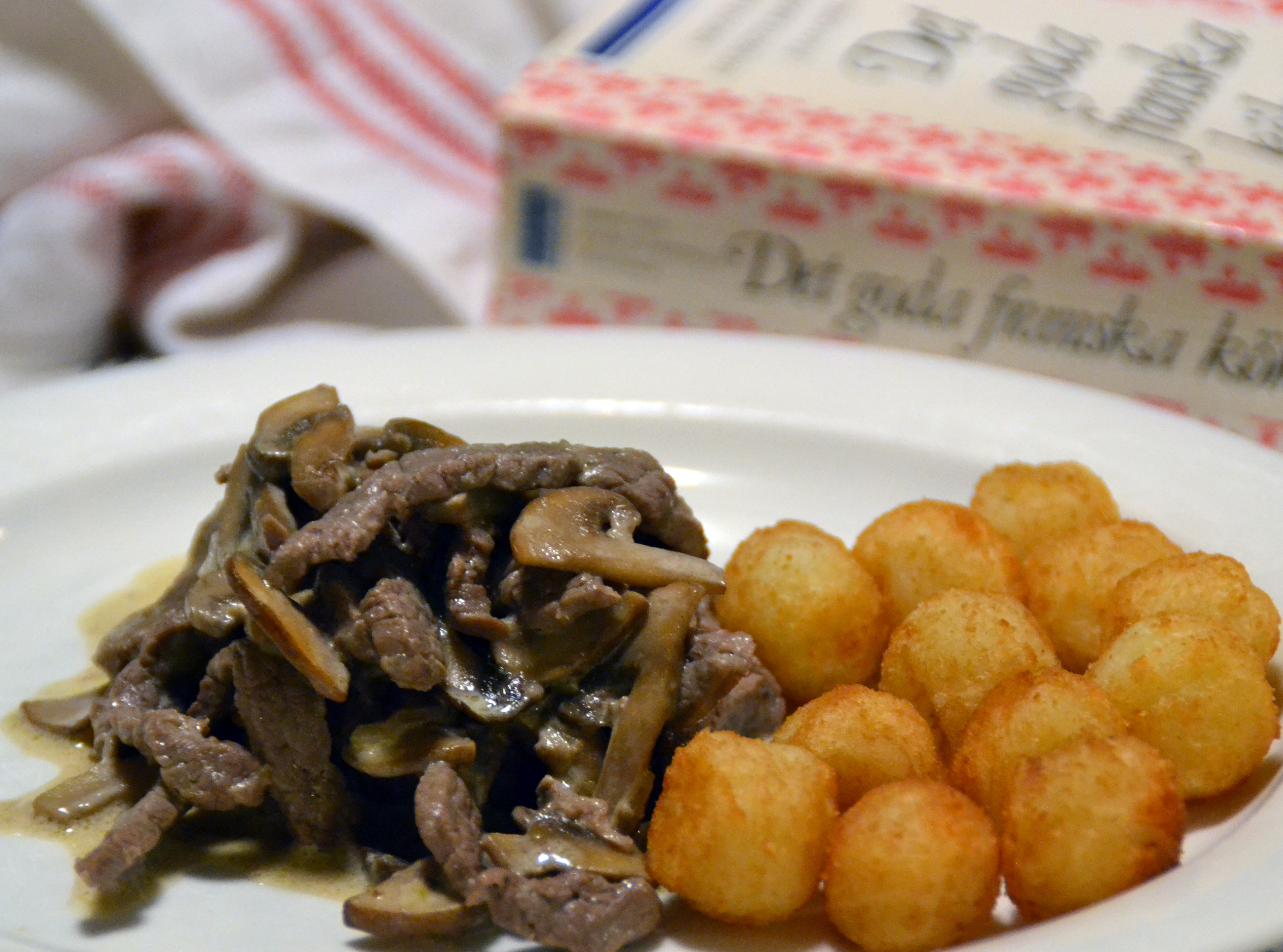 Som vanligt ändrar jag lite i receptet. Jag tror aldrig jag har följt ett recept rakt av, men i det här fallet var det ovanligt lätt. Man behöver inte ta mittbiten av en oxfilé för att strimla ner den till en sauté – och jag tror inte på kombinationen med vermouth och svamp.