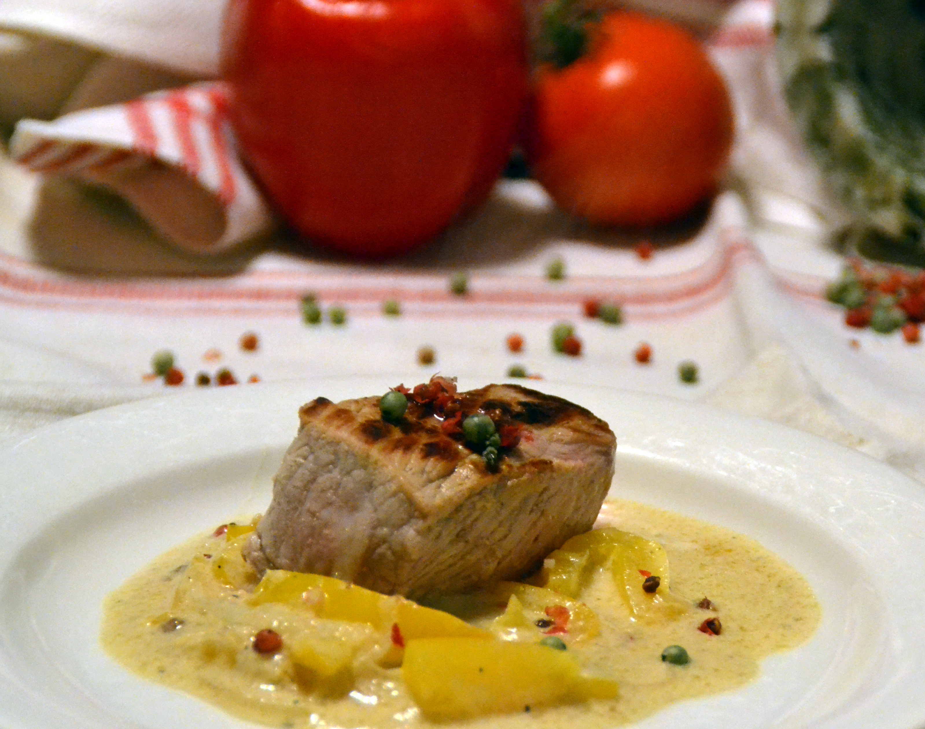 Ta bort överflödigt fett. Lägg ner löken och låt den fräsa en liten stund. Lägg i paprikan och fräs ytterligare en stund. Häll i crème fraiche & mjölk. Krydda med senap, smaka dig fram med den krossade pepparen. Koka ett par minuter tills grönsakerna är färdiga och köttet känns stumt när du trycker på det – då är det färdigt.