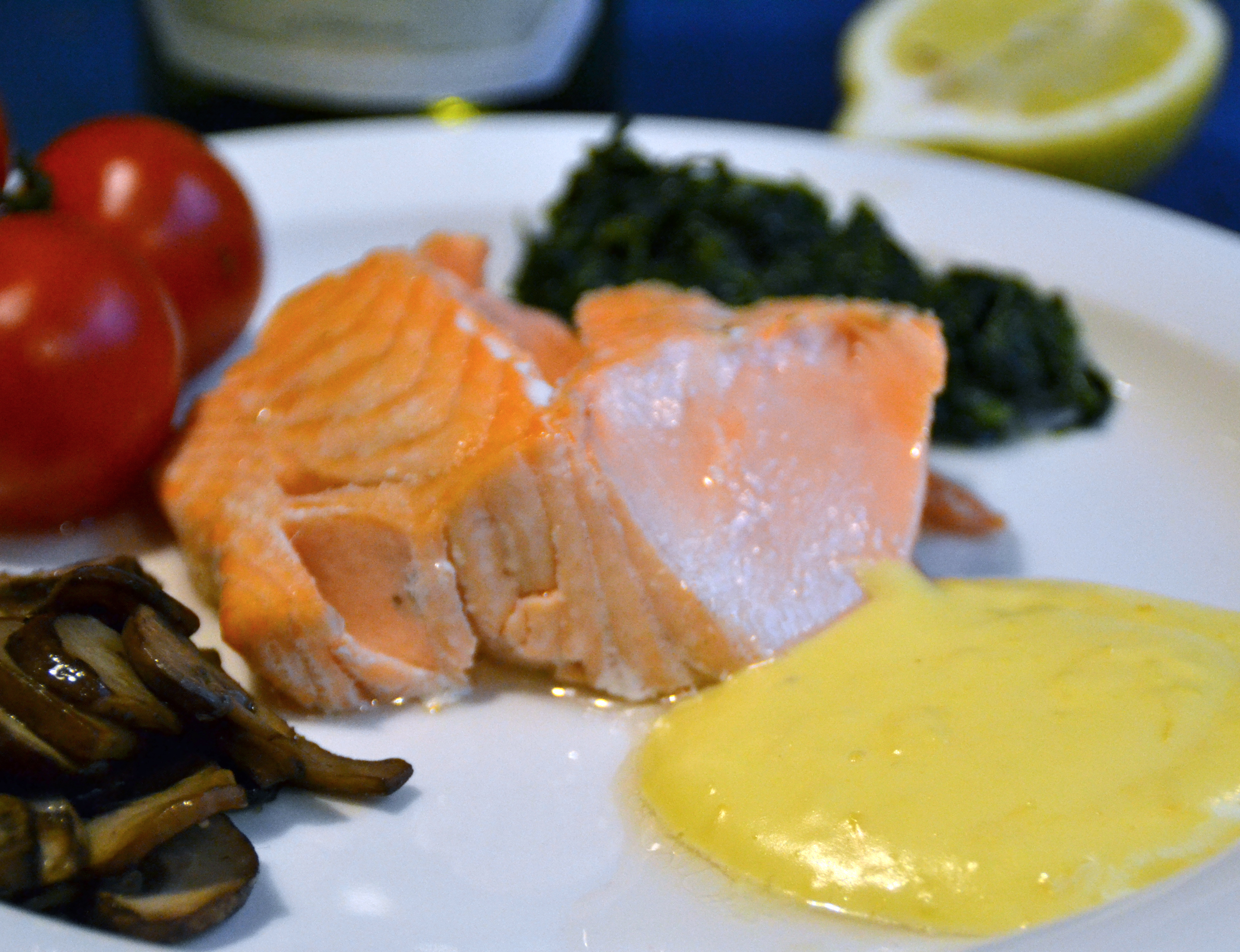 Den här citronhollandaisen har ganska hög citrussmak. Det blir fräscht & gott, men kräver ett vin som spelar i samma division – bra med syra, alltså. Vi drack en flaska Petit Chablis till laxen och hollandaisen. Och syran i vinet kände igen sig i citrussåsen.