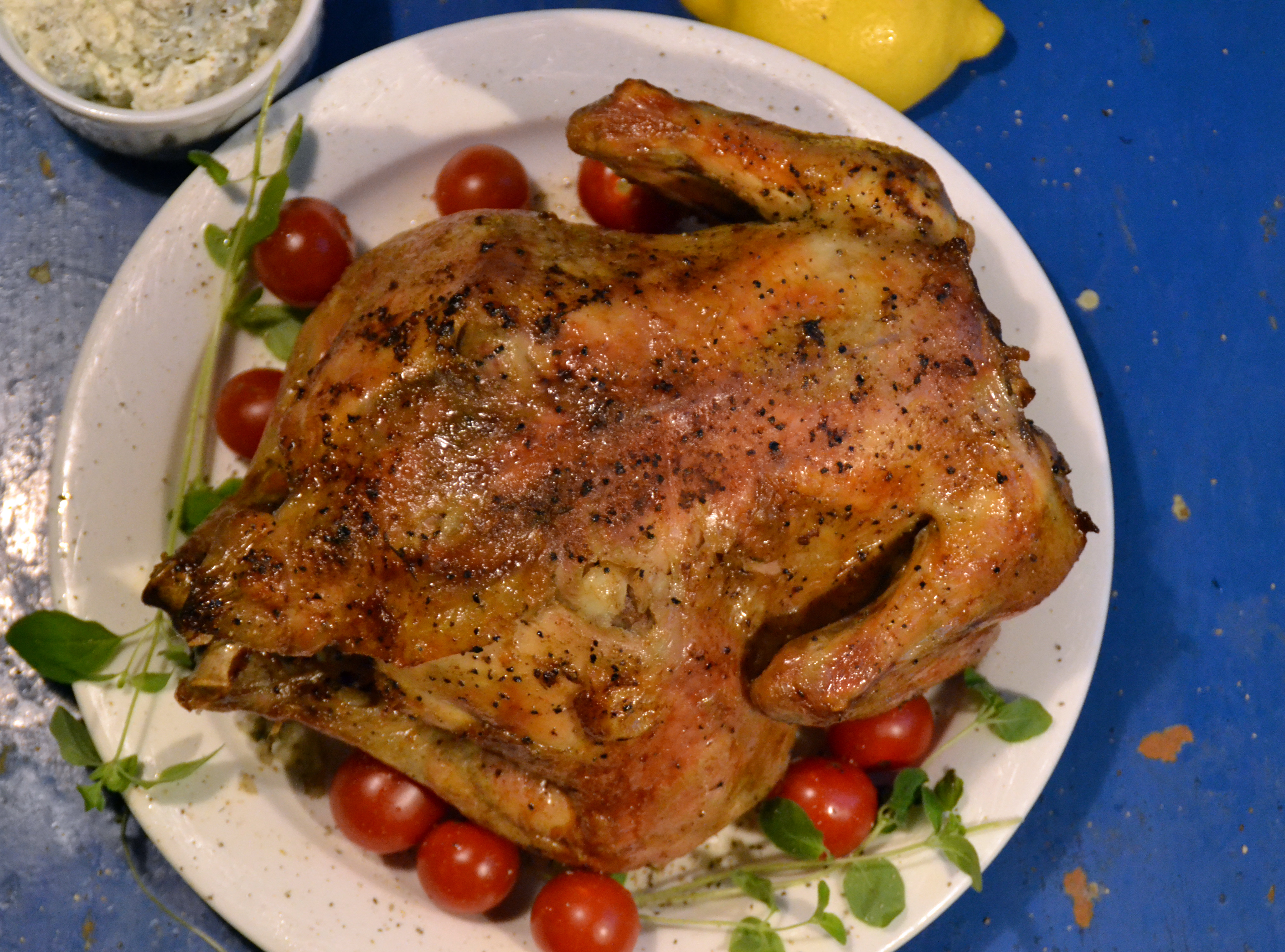 Om man helsteker kyckling och fyller den med örter & vitlök så får man saftigt kött och smakrik sky. Lite Pilaffris på tallriken och en skvätt rosé i glaset, sedan är bara att hugga in.