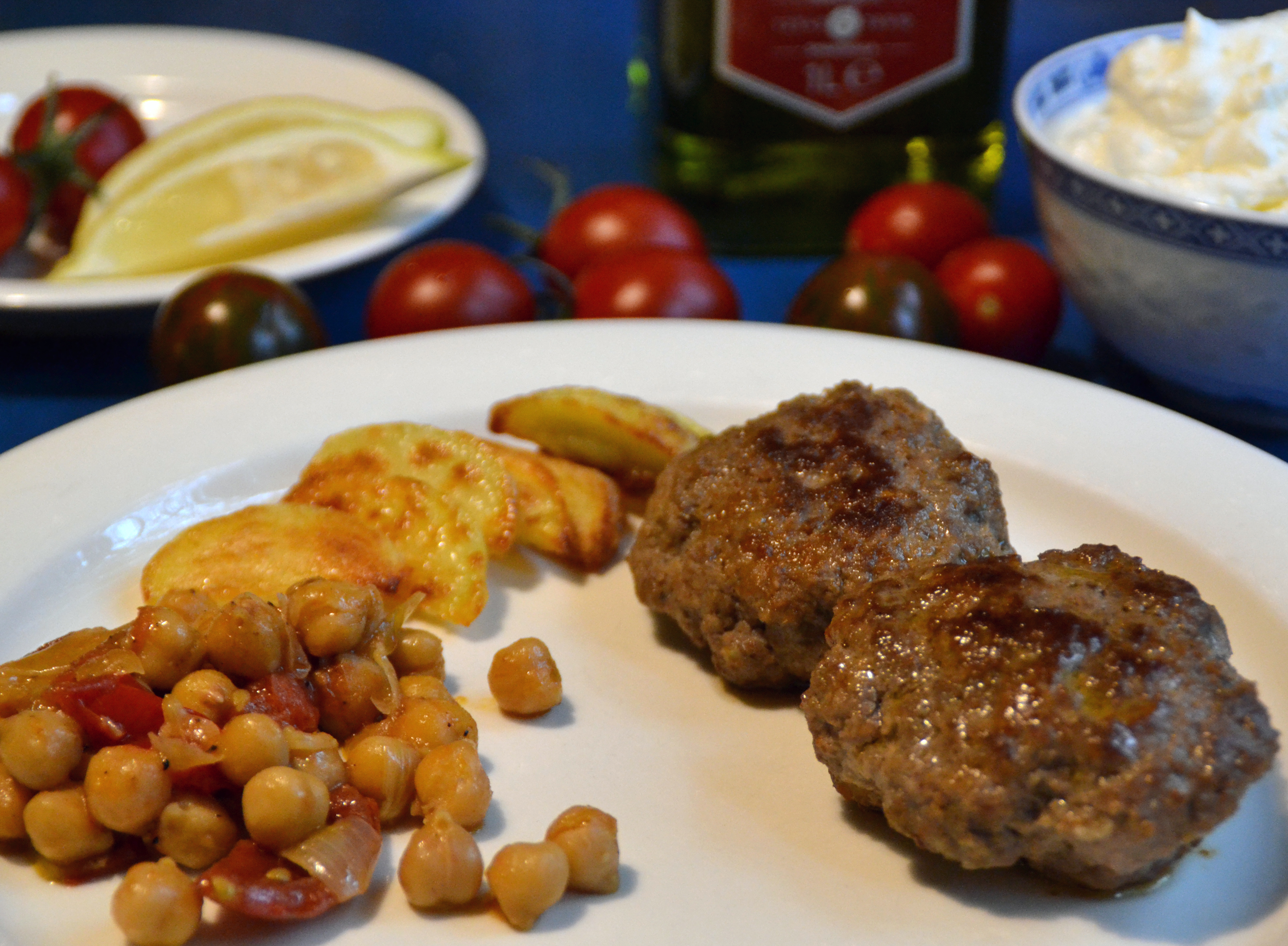 Hade vi haft mer tid, så hade vi lagt burgarna på grillen. Nu fick de en tur i stekpannan istället. På tallriken fick de sällskap av klyftpotatis, Kikärtstagine och turkisk yoghurt.