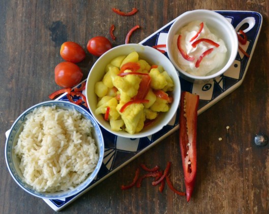 I den här indiska currygrytan får blomkålen spela huvudrollen tillsammans med potatis. Gott – tycker jag.