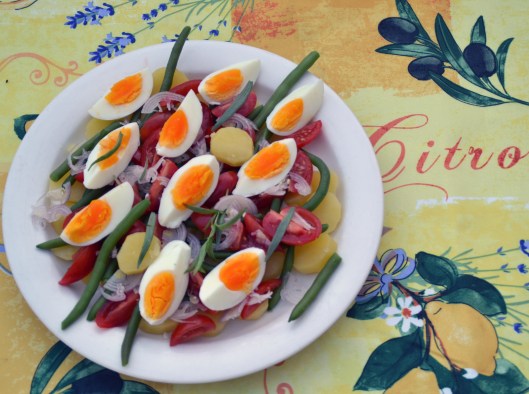 På kvällen blir det salade dijonnaise, potatissallad med ägg och tomat och gröna bönor. Ja och så fransk dijonsenap som bryter fint mot salladen.