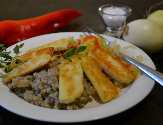 Men hon har en invändning mot receptet: det är för lite ost, så förslaget om mer halloumi kommer från henne.