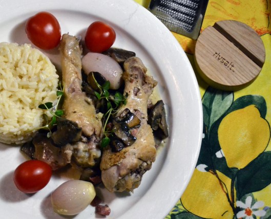 Vilken gryta det här är! Fyllighet från kyckling och svamp, pigg syra från vinet och så lite len gräddighet.