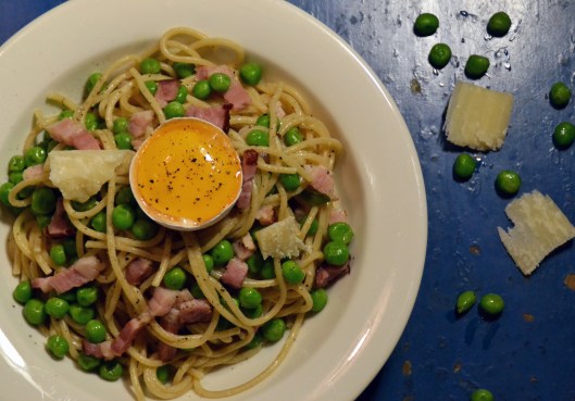 Men nu har det hänt något. Med rökt sidfläsk istället för bacon… med stekta ärtor istället för kokta… med lite crème fraiche och pastavatten… så kan carbonaran vara en liten delikatess.