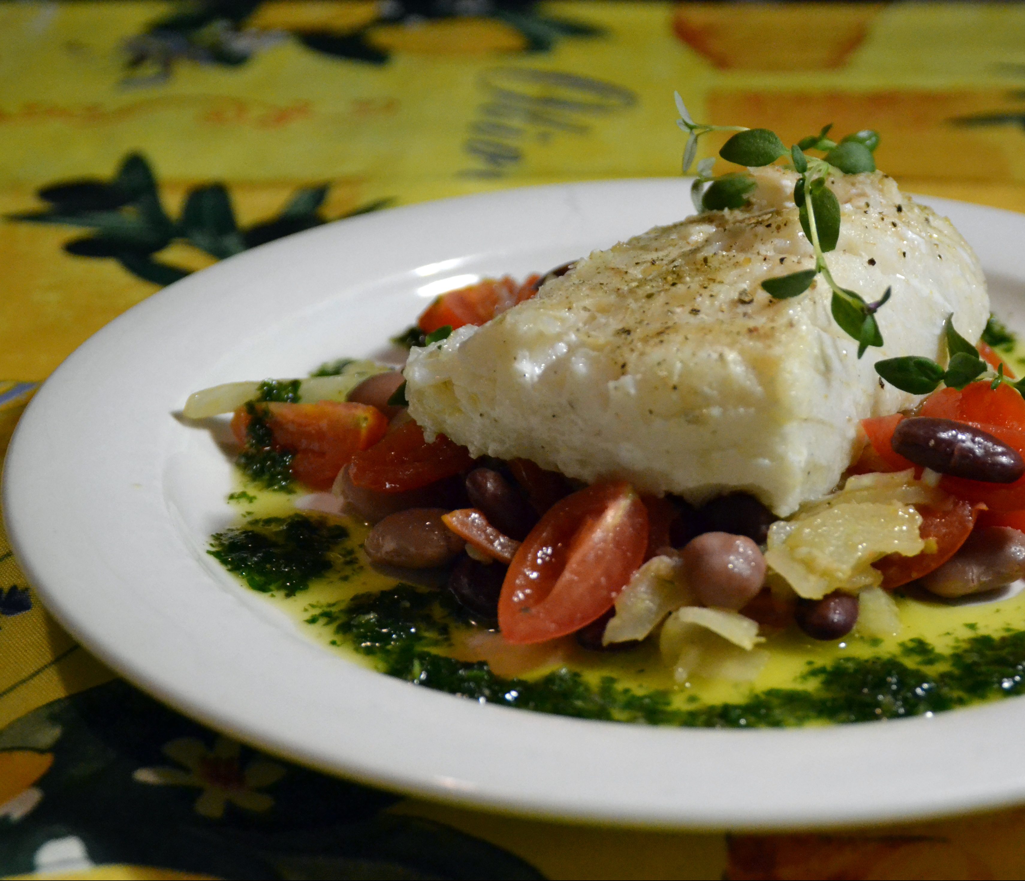 Ansa fänkålen, skär bort ”rören” och ev fula delar. Dela i kvartar, skär bort roten och strimla fänkålen tunt. Skölj och skär tomaterna i kvartar. Stek i olja i 10 – 12 minuter. Krydda med salt, svartpeppar & lite riven vitlök. Lägg i tomater och bönor. Stek en minut så allt blir varmt.