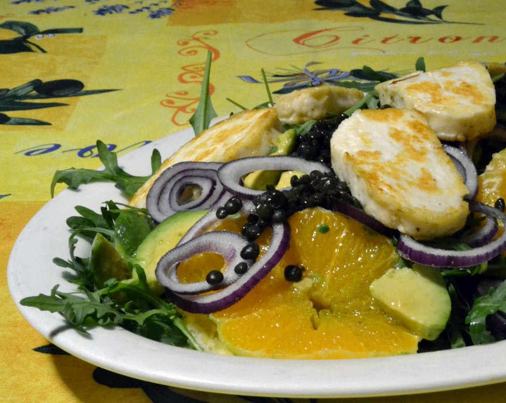 Halloumins sälta bryter fint mot det söta i apelsinen. Ruccola bidrar med pepprighet och linser med tuggigt motstånd.