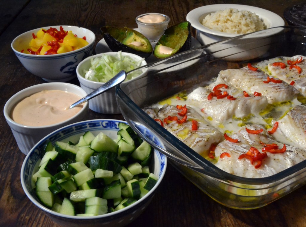 Mitt första anspråkslösa vardagsförslag är: våga använda frysta råvaror och halvfabrikat när du står där framför spisen en vanlig tisdag. Den här maten är lagad på (styck)fryst torsk, fryst mango och färdig majonnäs.