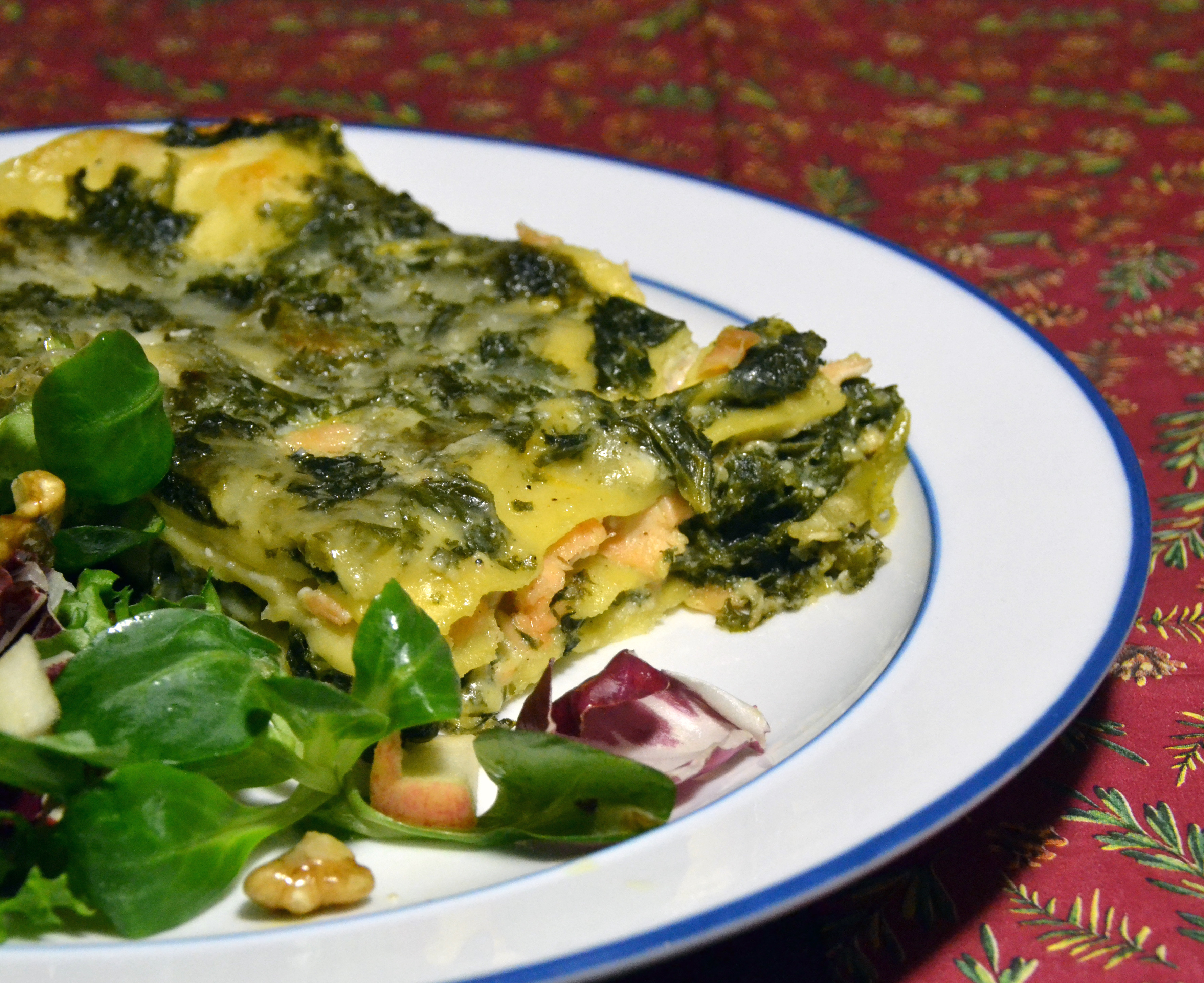 Men ibland blir det besvärligt, så är fallet med den här lasagnen. Jag var säker på att den inte skulle komma på bloggen och struntade därför i penna och anteckningspapper. Men när vi åt så såg hustrun så där nöjd ut som hon gör när något är gott. Och sonen – numera vuxen och lång som en flaggstång, men fortfarande fientlig till grönkål – han sade med förvåning i rösten: ”Det här var ju gott!”