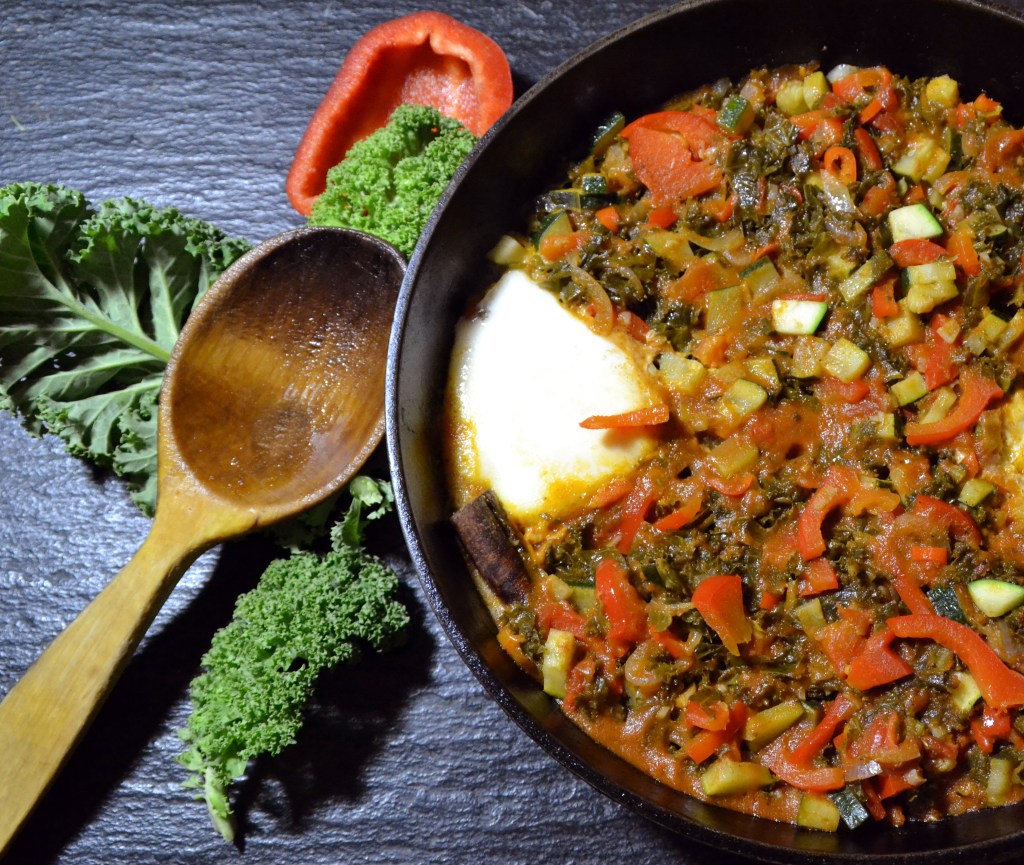 Den här vinterkvällen blev det en chakchouka (stavas också shakshouka). Enligt Wikipedia är det en tunisisk äggrätt, men en mycket enklare förklaring ser ut så här: Det är den franska grönsaksröran ratatouille med ägg och nordafrikanska kryddor.