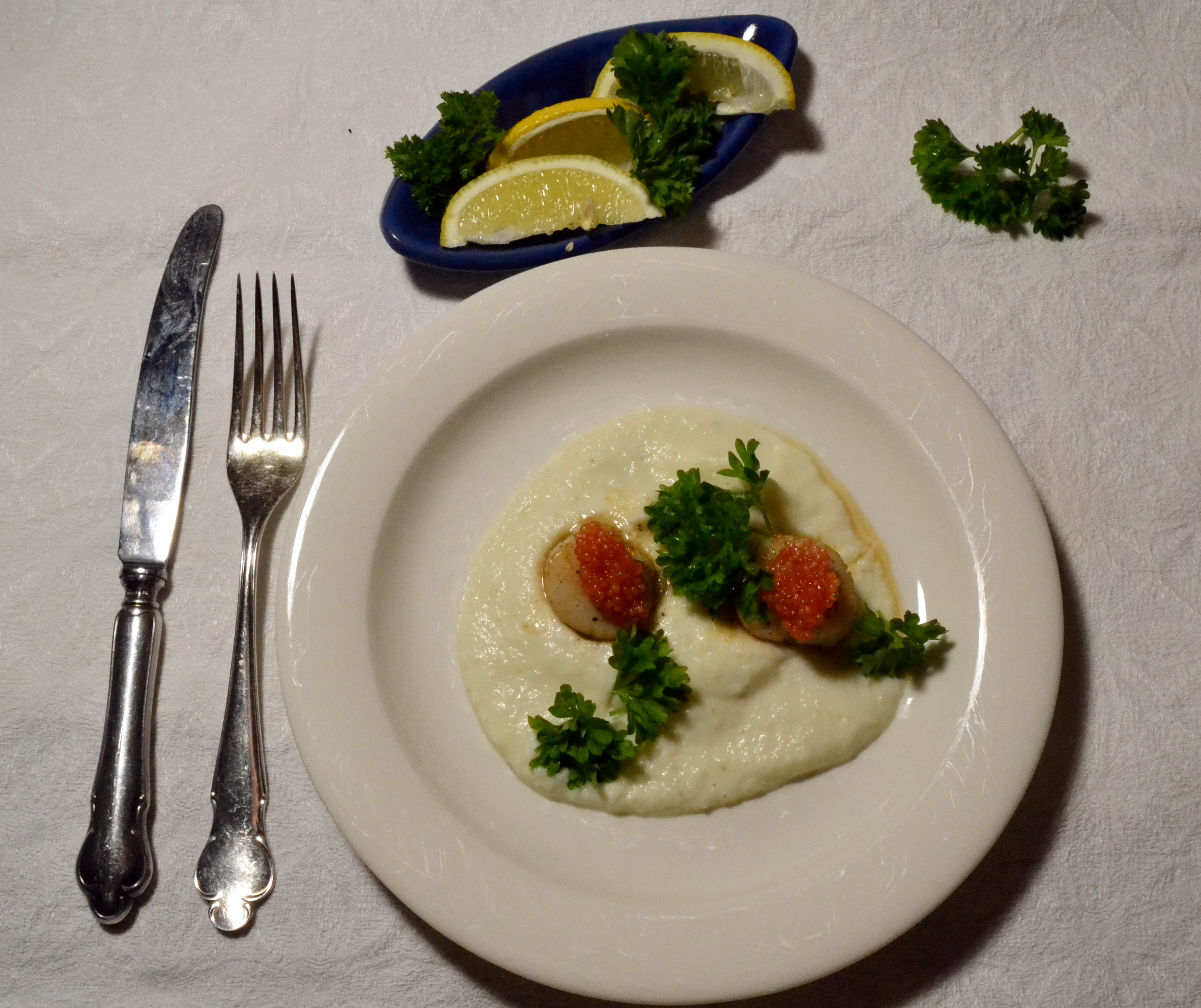 Spänstiga pilgrimsmusslor, len blomkålscrème och så de salta små romkornen. Det här är en liten delikatess,