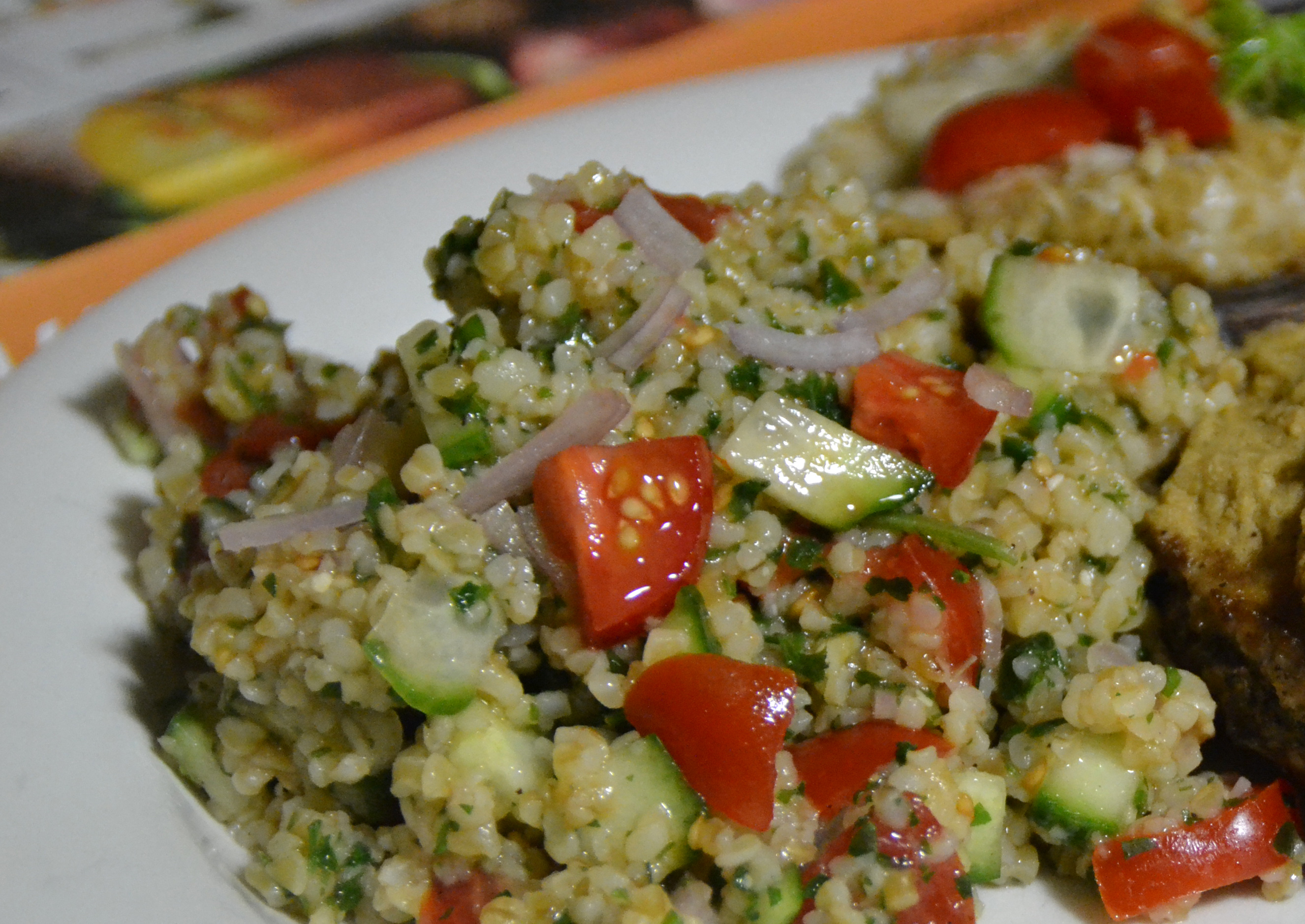 På vårvintern kan den – som här – innehålla rätt mycket bulgur, men när solen står högt en julidag får vetegrynen ge plats för mer persilja, mild lök och solmogna tomater.
