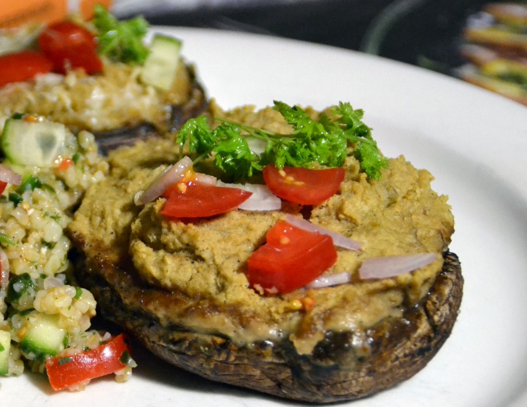 Man svänger förbi mataffären och får med sig lite portabellosvamp hem. Sedan mixar man kikärtor till en god hummus. Lägger kikärtsröran i svamparna och gratinerar dem i ugnen.