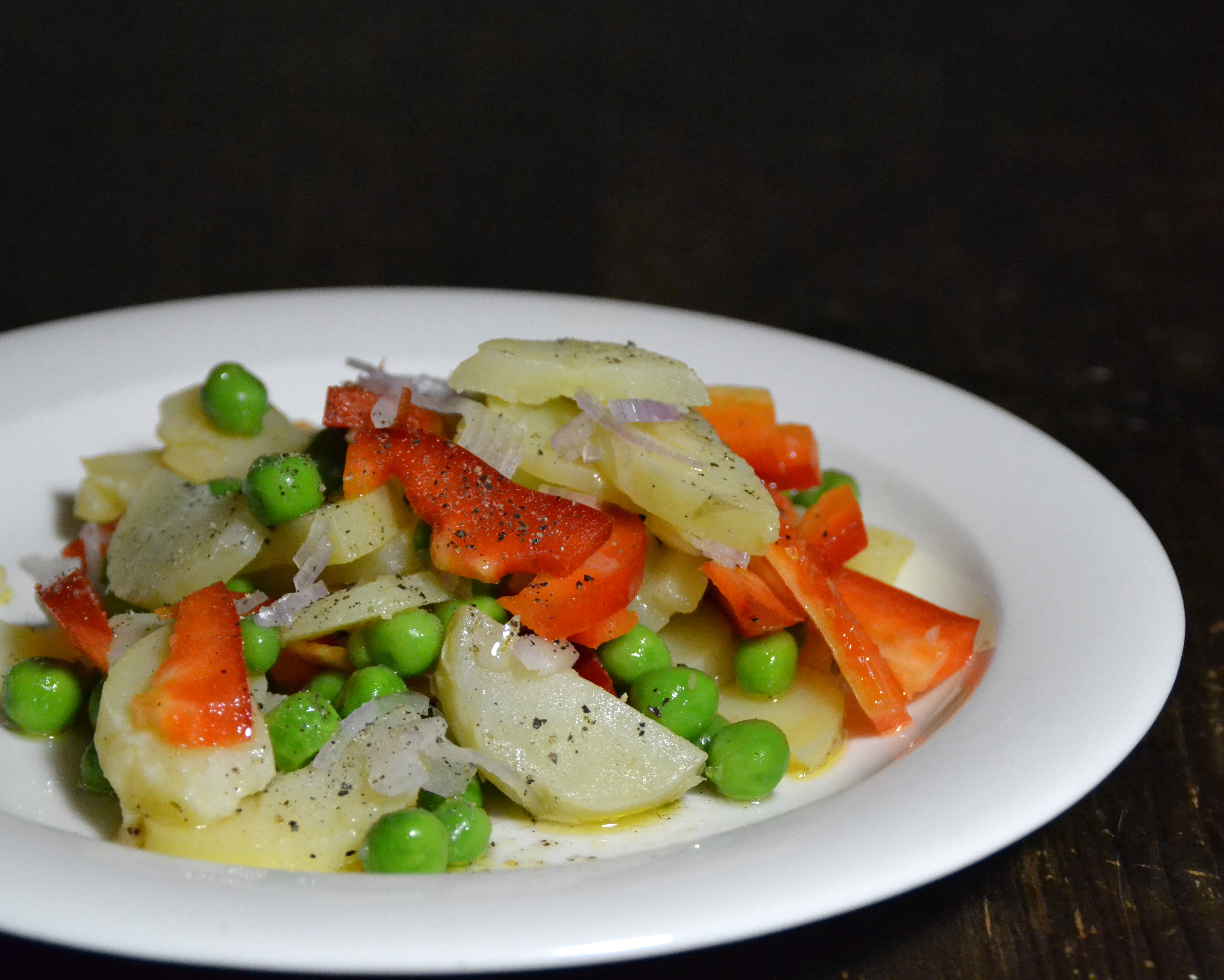 Så jag drar fram skärbrädan och börjar. Finhackar schalottenlök, strimlar paprika och skivar potatis. Gör en vinägrett på 2 delar olivolja, 1 del vit balsamvinäger, salt & svartpeppar. Blandar alla grönsakerna och häller över vinägretten.
