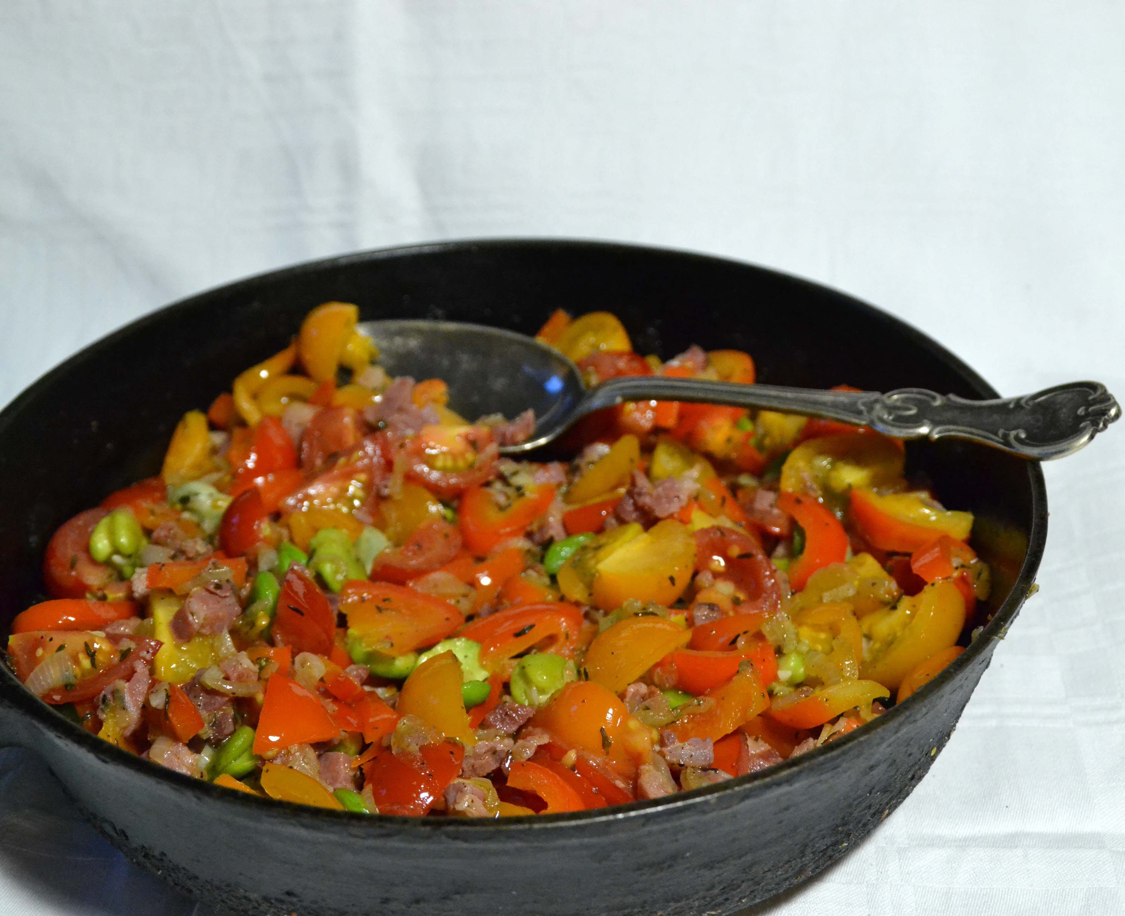 Stek bacon knaprigt utan extra olja. Ta upp bacon, häll i lite olja och fräs lök och bondbönor i ca 3 – 4 minuter. Lägg i paprika och vitlök, krydda med (lite) salt, svartpeppar och timjan. Fräs 3 – 4 minuter. I med körsbärstomater och bacon, fräs i ytterligare 3 – 4 minuter.