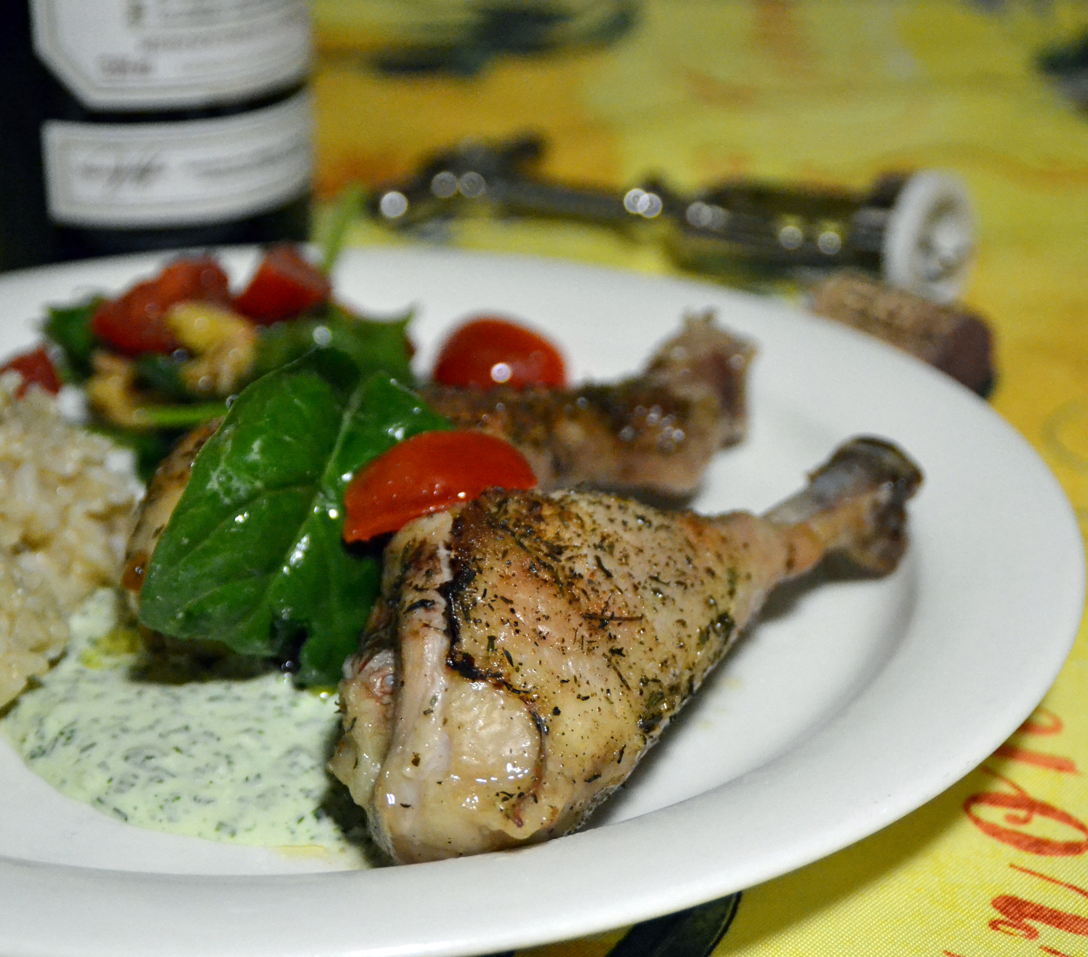 Sätt ugnen på 225 grader. Olja en ugnsform, och lägg dit kycklingbenen. Salta, peppra och strö över 1/2 tsk timjan. Kör i ugnen i ca 15 minuter. Ta ut ugnsformen, vänd kycklingbenen. Krydda med salt, peppar och 1/2 tsk timjan. Ugnsstek tills kycklingen är klar. Tar ytterligare ca 15 minuter. Stick i kycklingen och kolla så köttsaften är klar (genomskinlig).