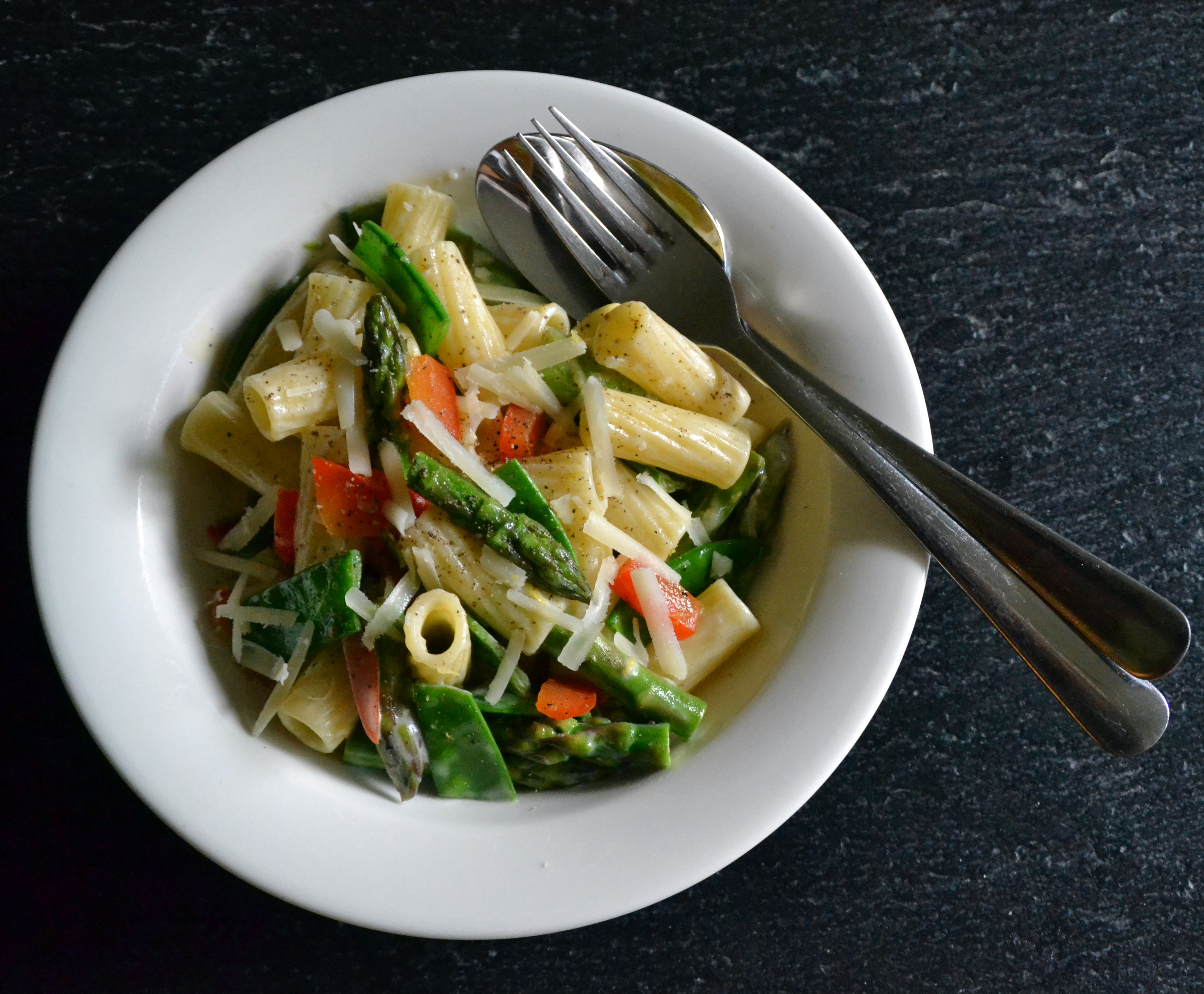 En fräsch pastarätt som blir klar på en kvart. Full med primörer som sparris och sockerärtor. Kan det bli bättre?