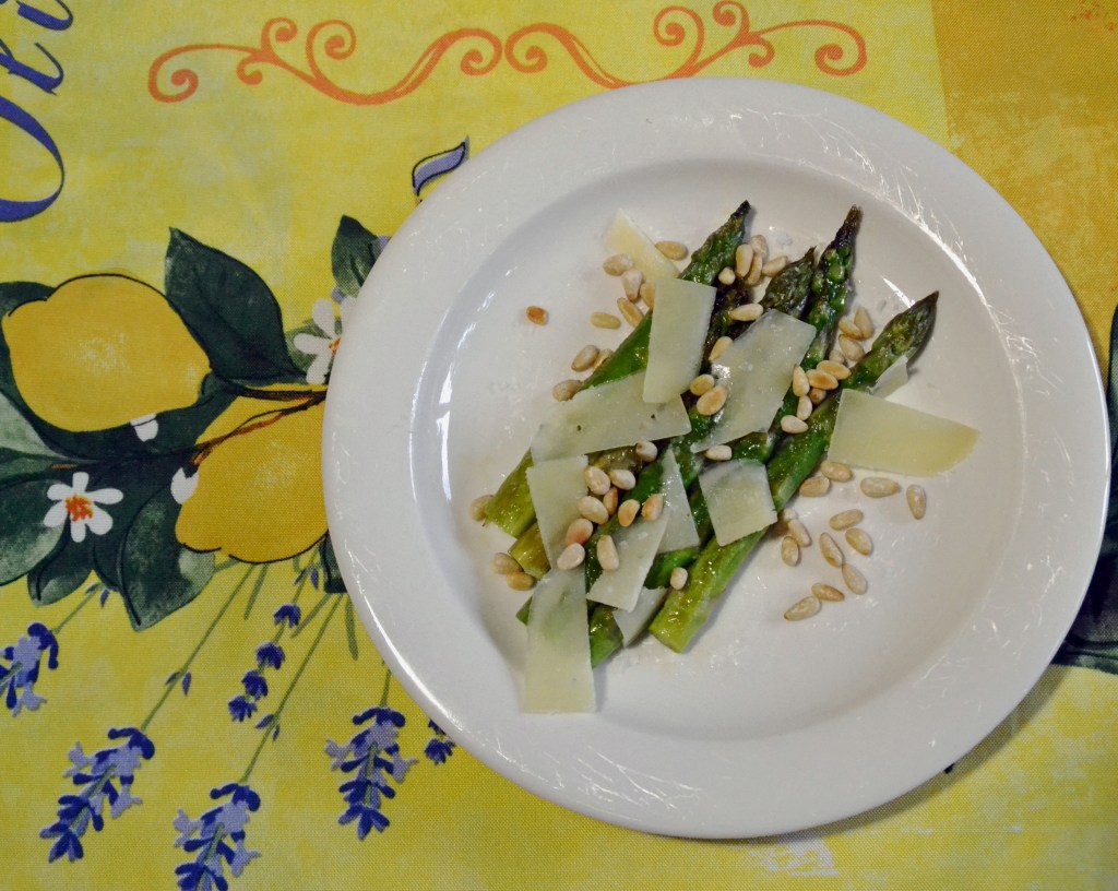 Lägg den varma sparrisen på assietter. Strö över rostade pinjenötter och flagad parmesan.