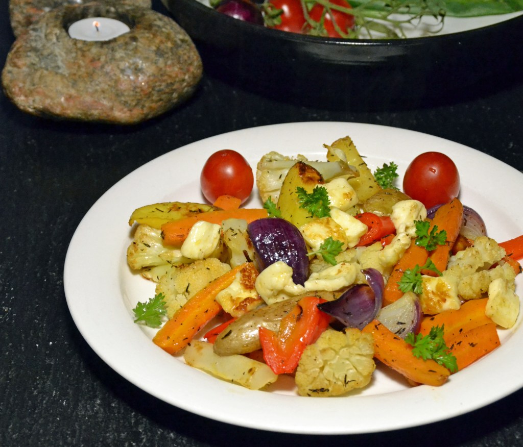 Lägg ner morötterna i långpannan och låt dem ugnsbakas i 30 minuter. Låt löken få 20 minuter i ugnen, blomkålen 15. Paprika och de hela tomaterna behöver inte mer än 10 minuter.