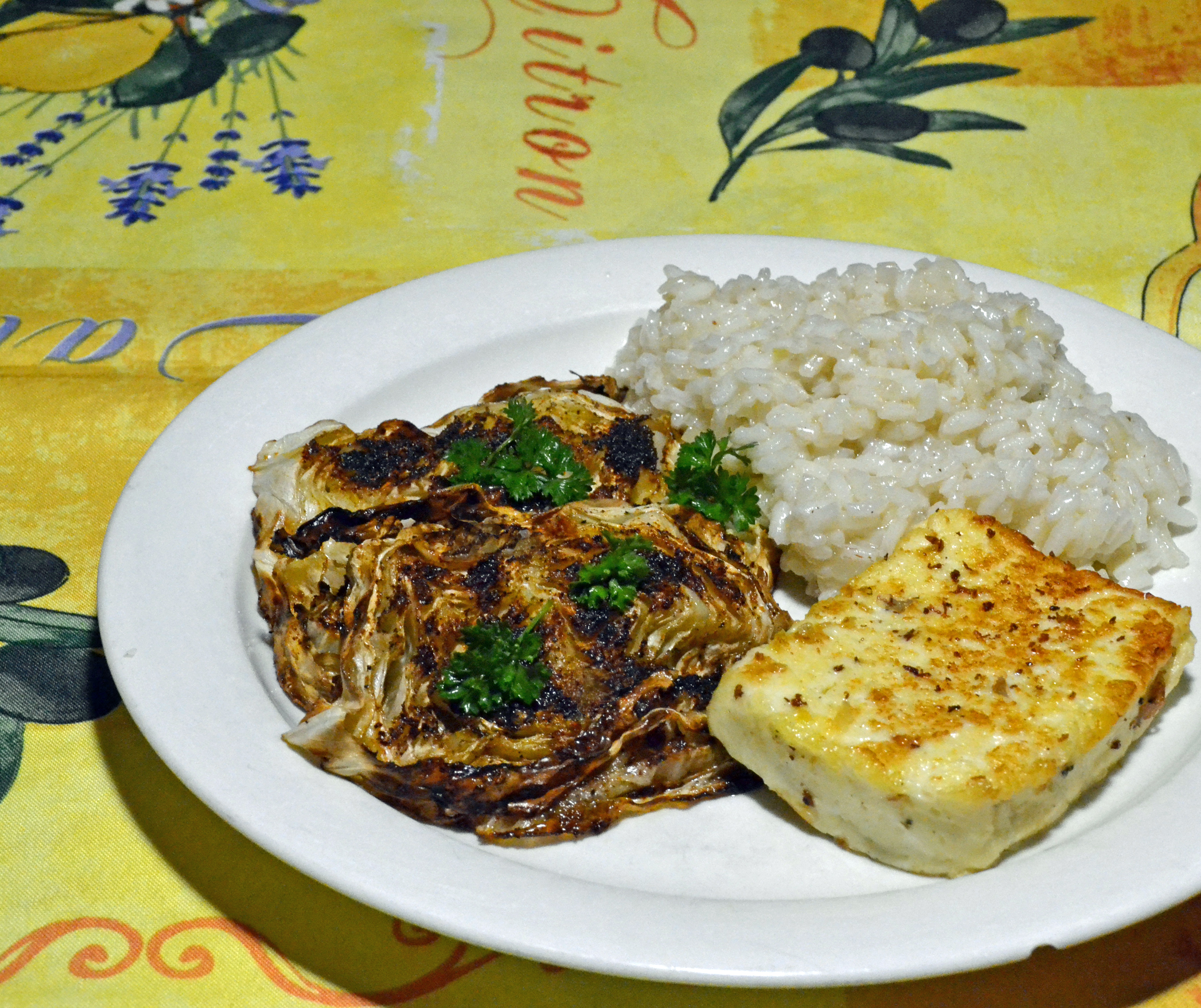 Vi åt den ugnsbakade kålen med risotto och stekt halloumi, men man kan ha den både som en ensamrätt med bröd och sallad – eller som ett tillbehör till en grillad bit kött eller fisk.