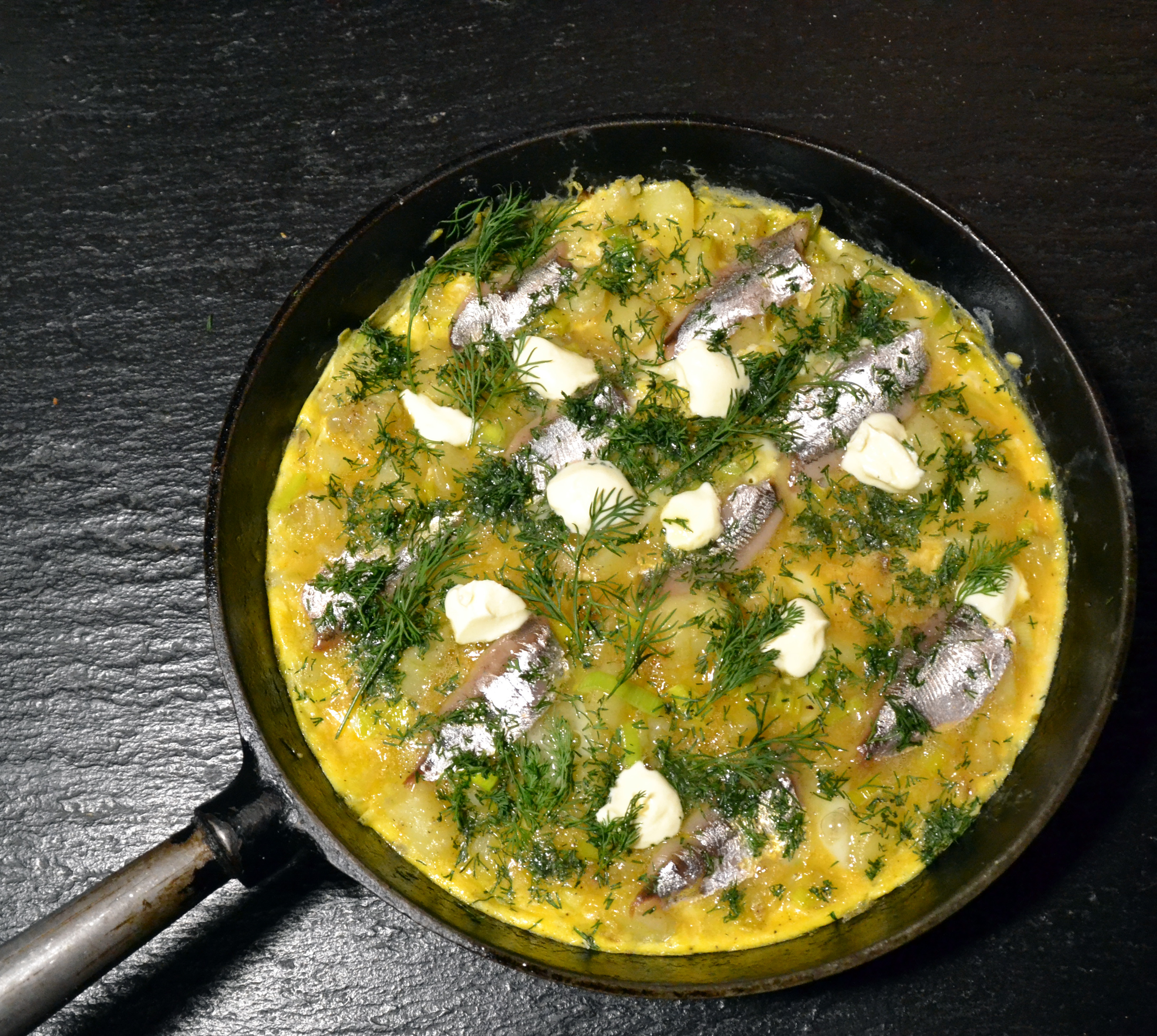 Häll i äggen. Vicka lite på pannan och lyft på potatisen/löken så äggen kan rinna ner. Lägg på ansjovisfiléer och hackad dill.