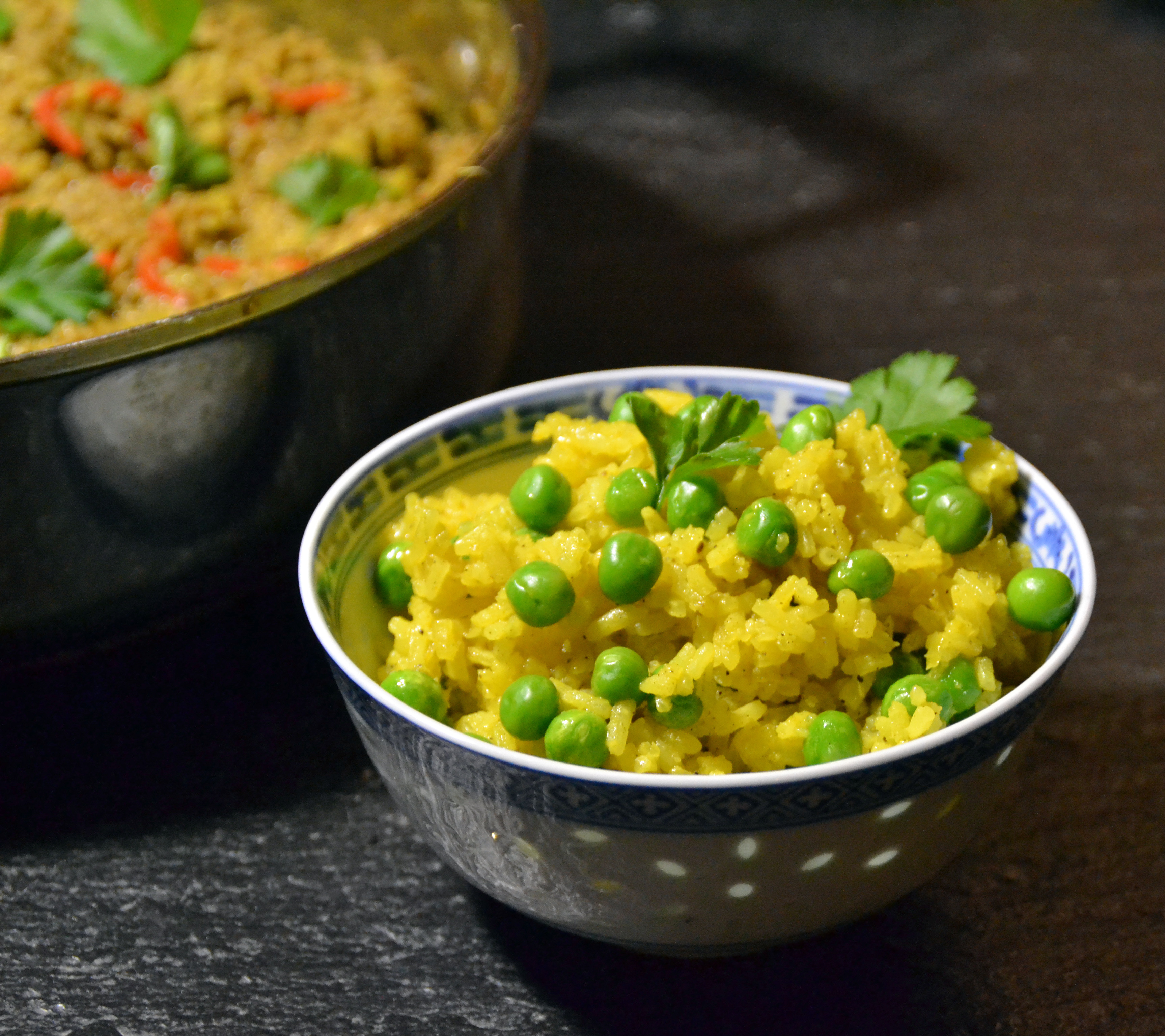 Det här riset är fullt med varma, fylliga smaker. Gurkmeja, kardemumma och spänstiga ärtor ger riset ett lyft, som räcker långt utöver det indiska köket.