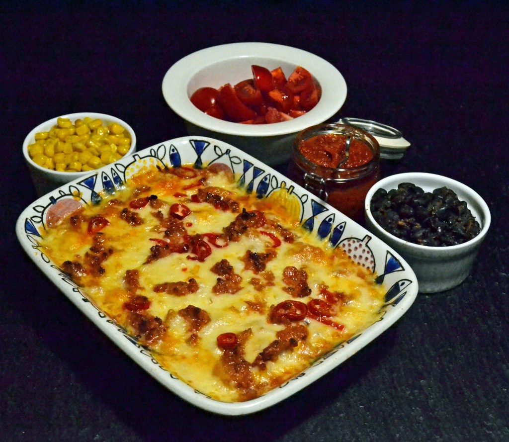 Ja, och så gör jag den här gratängen med massor av ost och korv. Vi äter den till tacos med salsa och några av de vanliga tillbehören. Men man kan också använda den som nachos-dipp.