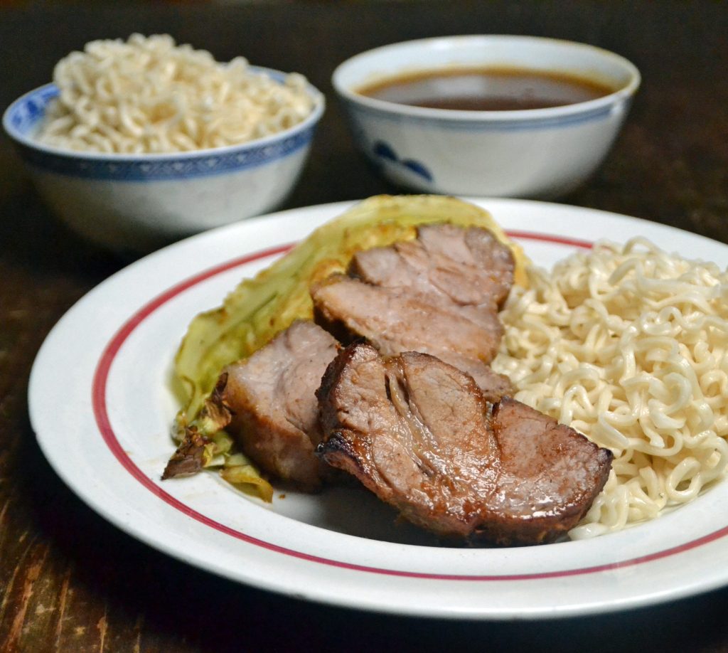 Ta fram köttet ut kylen, skrapa av marinaden och häll den i en kastrull. Lägg köttet och spetskålen på ugnsgallret. Pensla kålen med olja, salta & peppra den. Sätt en långpanna med lite vatten under (bra för disken och så gillar köttet den fuktiga värmen).