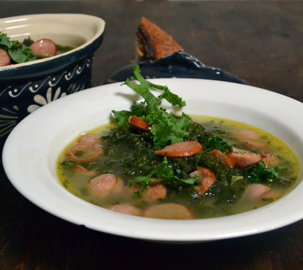 Den var en varm (caldo) soppa och den var grön (verde) av grönkål. Och så fanns där lite kryddig korv som piggade upp.