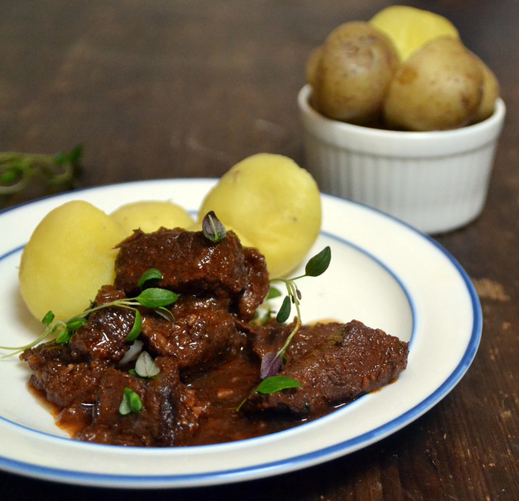Lägg i kanelstång och hackad vitlök. Häll på vinet och buljongen. Låt grytan koka på svag värme i 2 – 3 timmar tills köttet är så mört att det nästan faller sönder när du tittar på det.