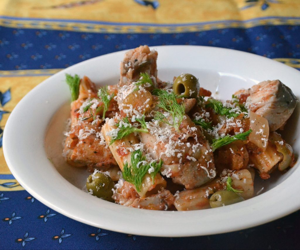 Fisken: Skär den i små grytbitar, Salta & peppra. Lägg ner fisken och oliverna i tomatsåsen och låt den nästan-koka i så där en 5 minuter.