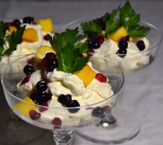 Efter maten är det dags för citronmousse – enkelt & fräscht. Ta frysta bär som du gillar. Vispa ihop mascarpone och citron med kvarg & vispgrädde. Vänd ner lemon curd. Enkelt och gott.