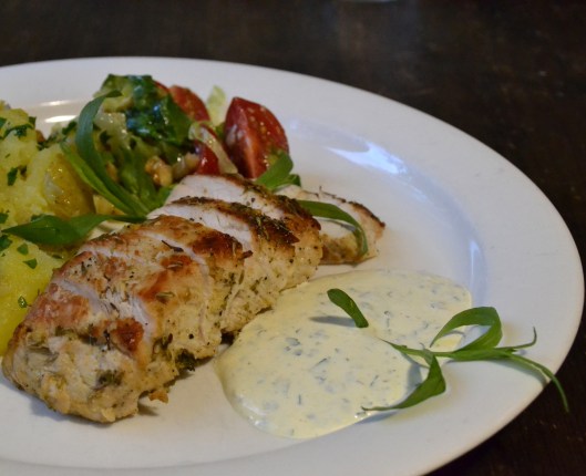 Som huvudrätt funkar Karins kalkon väldigt bra. Det är kalkonfiléer som ugnssteks med en marinad som piggar upp. Till det har man kall bea med crème fraiche som bas och dragon och vinäger som i en vanlig bearnaise. Fräscht och faktiskt väldigt vårlikt.