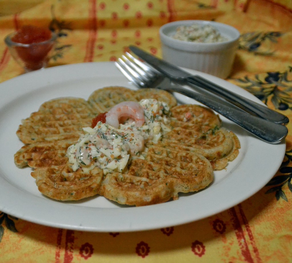 Våfflor är gott, och det gäller inte bara dem med sylt och grädde. Gör man våfflor med fullkornsmjöl och spenat i smeten, och toppar med räkor och rom blir det en helt annan rätt.