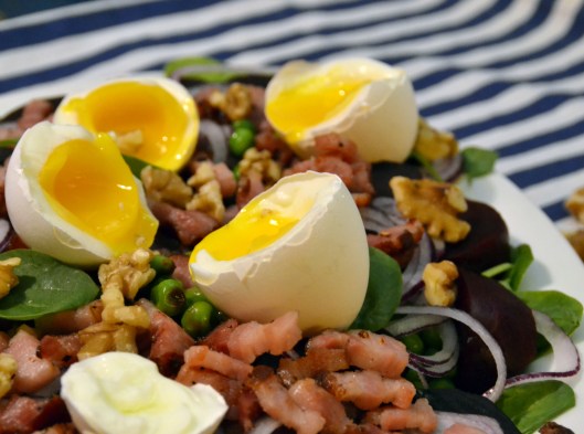Gör som jag och sätt gurkskivor på sidorna. Lägg ägg ovanpå. Toppa med räkor, ihoprullade laxskivor och rom. (Eller ännu hellre: hitta på ett snyggare sätt!)