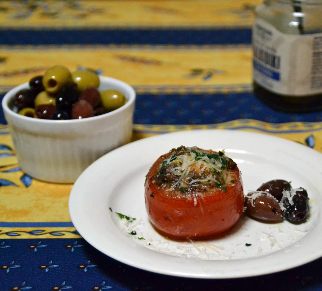 Blanda tapenade med riven vitlök och strimlad persilja. (Här kommer ett recept om du vill ha vegetarisk tapenade). Fyll tomaterna med tapenadeblandningen. Strö över riven parmesan och kör i ugnen i ca 30 minuter.