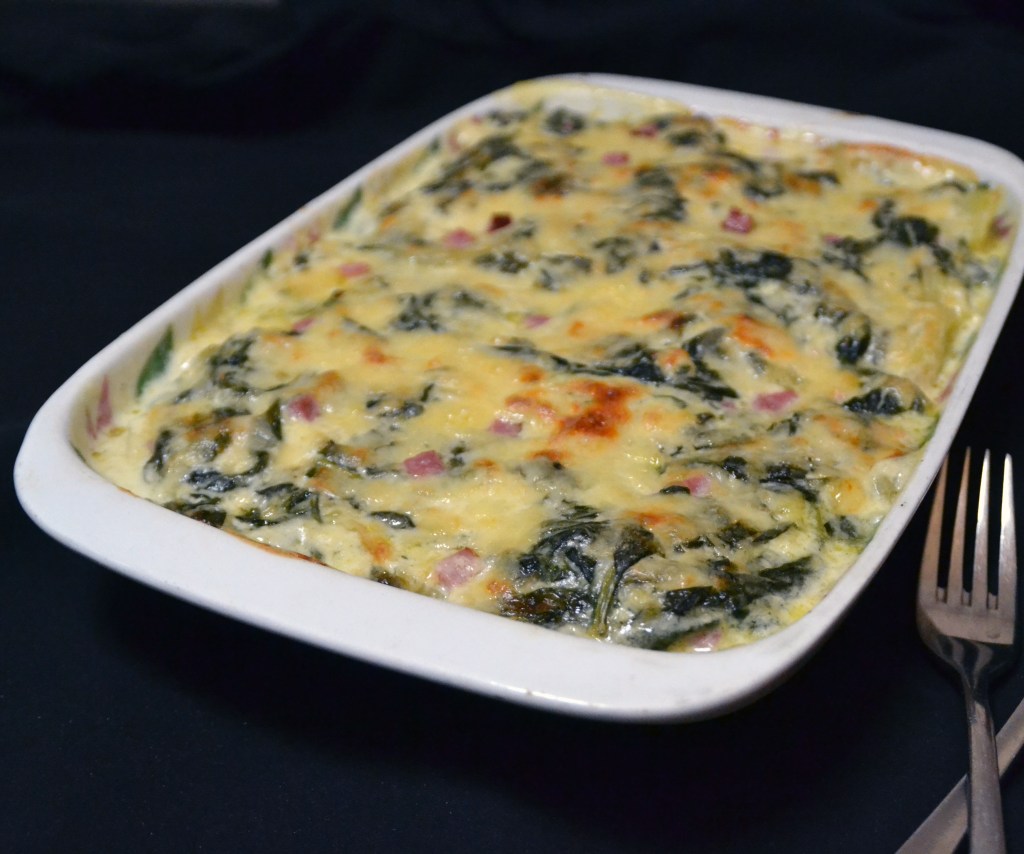 Det här är mat för dagar när vinden viner utanför dörren och snömodden blåser horisontellt över världen. Då kan man gå in, sätta på ugnen och trösta sig med en värmande gratäng, full av smak från ostsås, spenat och rökt skinka.